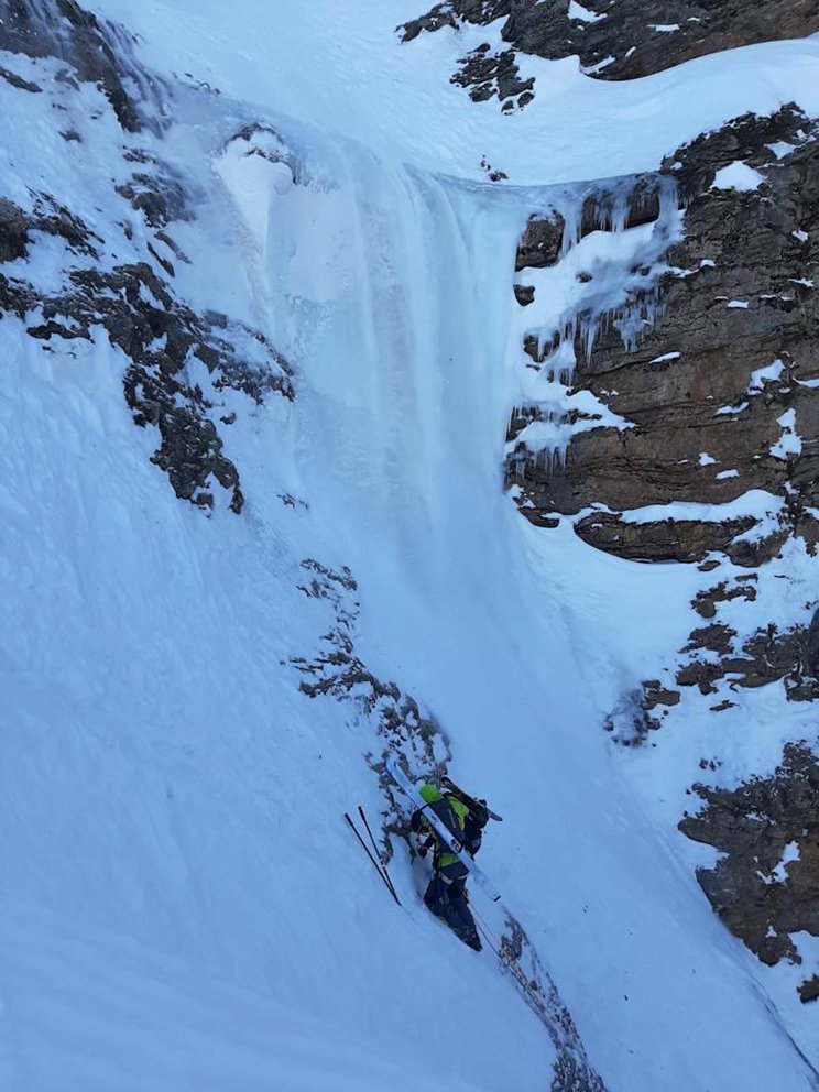 4 x muss man abseilen, die Abseilstellen sind eingerichtet (60 m Einfachseil nötig). Bei wenig Schnee kann man unter dem Klemmblock durchkriechen/fahren, sonst abseilen (4. Abseiler).