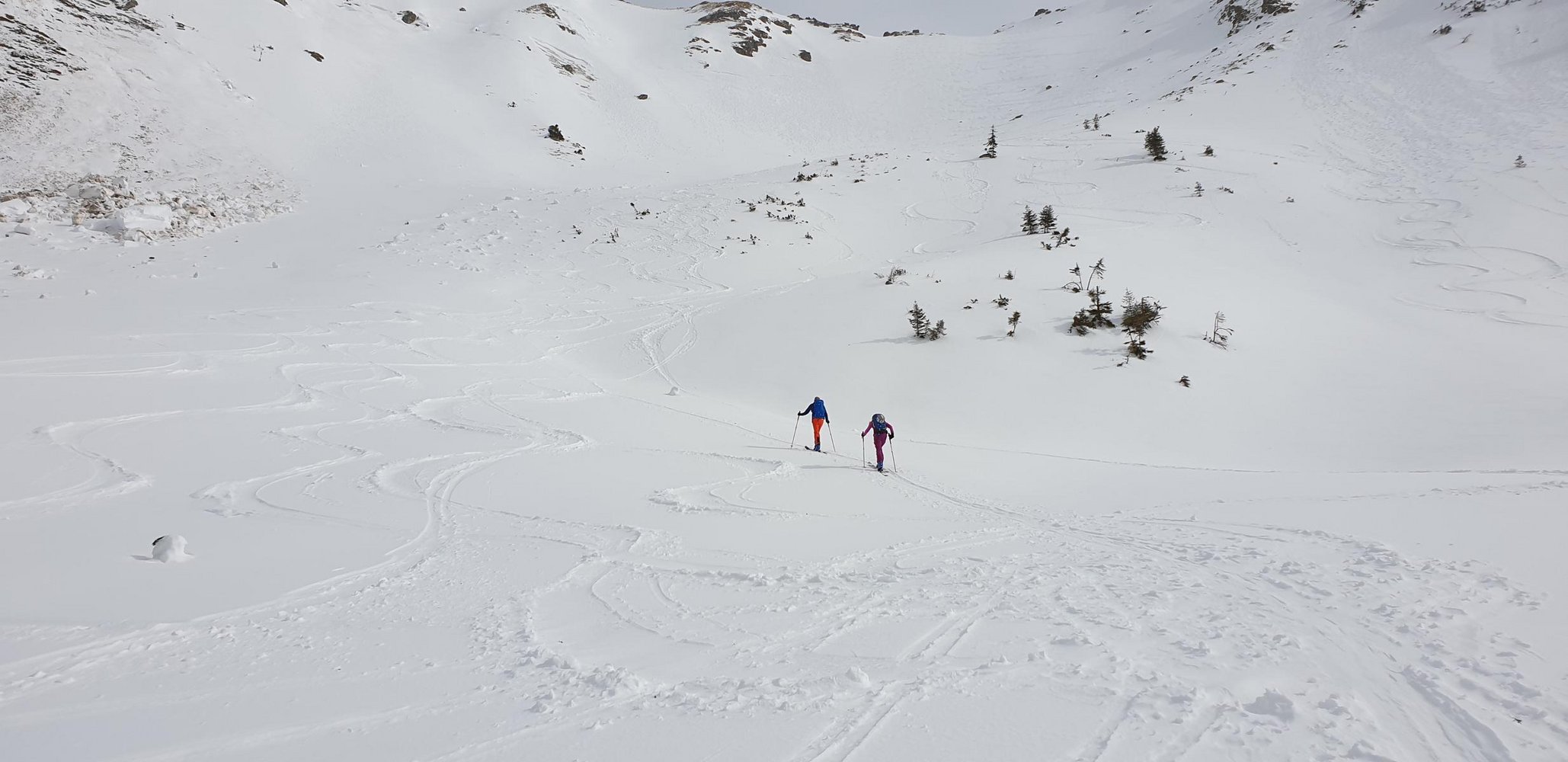 b) links über die nach oben hin steiler werdende Westflanke hinauf bis zum Grat in einem flachen Sattel (Skidepot) und zu Fuß über den Nordwestgrat noch 150 Hm zum Gipfel.