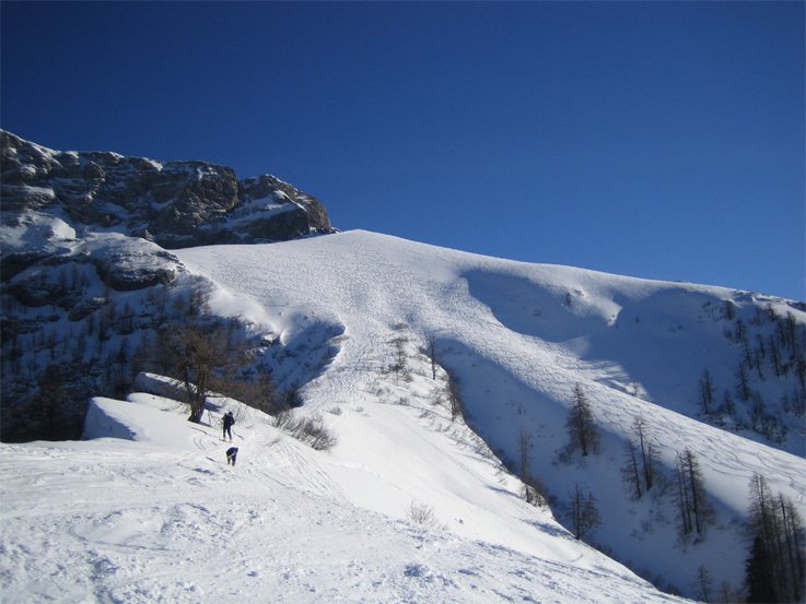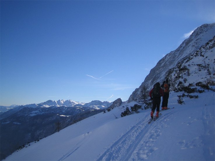 Problem-Passagen bei unsicheren Schneeverhältnissen: Die Querung unter dem Fagstein und ab dem Brotzeitfelsen vor dem kurzen Aufstieg auf die Hohen Rossfelder.