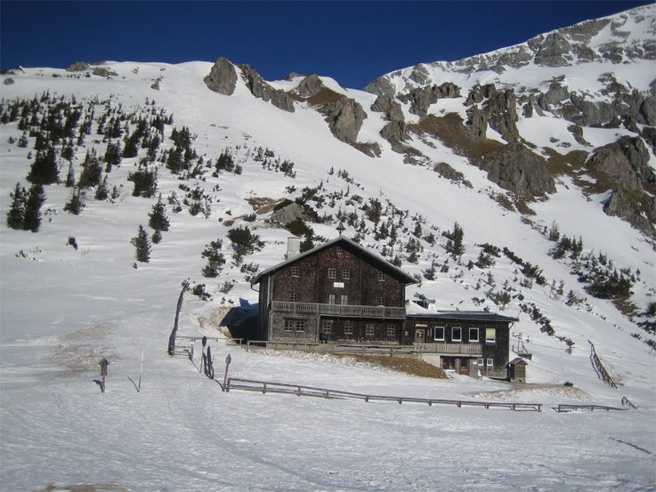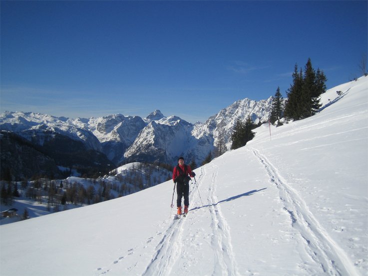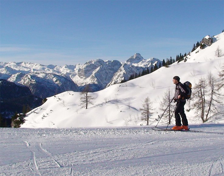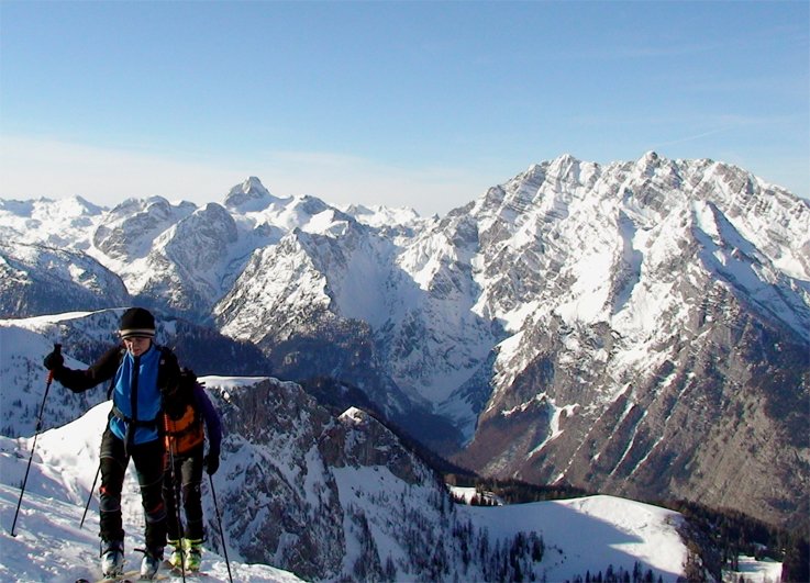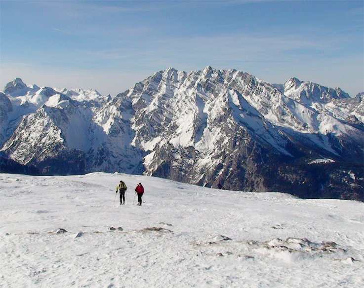 Abfahrt: Vom Schneibsteingipfel fährt man in die Windscharte (ca. 2100 m) ab. Nun unter der Nordwestseite des Winschartenkopfes queren bis man in die Einbuchtung zwischen Fagstein und Windschartenkopf kommt. Dort bietet sich die Besteigung des Fagsteins (2164 m; Plus 150 Hm) an, von dem man den freien Ausblick auf Watzmann und Königsee genießen kann. Verzichtet man auf den Fagstein, fährt man unterhalb seiner Südostseite weiter, vor der Bergwachtshütte hält man sich rechts und gelangt zum sog. Brotzeitfelsen. Von diesem steigt man oberhalb der verfallenen Roßfeldalm auf die sog. Hohen Rossfelder auf (meist mit Fellen, geht aber auch ohne; Stangenmarkierung beachten!). Dort quert man weiter in nördlicher Richtung bis man gut zur Preisbergalm (auf einem markanten gratähnlichen Kamm) abfahren kann. Von der Alm rechts hinunter über den flachen Boden des Priesbergmooses, vorbei an der Brennhütte, bis man in einem Graben vor der Königsbachalm bei einer Brücke auf den Fußweg zur Jenner-Bahn Mittelstation trifft. Auf diesem gelangt man - anfangs aufsteigend, dann flach - zur Jenner-Bahn-Mittelstation und von dieser auf der Piste bzw. Forstweg zurück zum Ausgangspunkt (Parkplatz Hinterbrand).