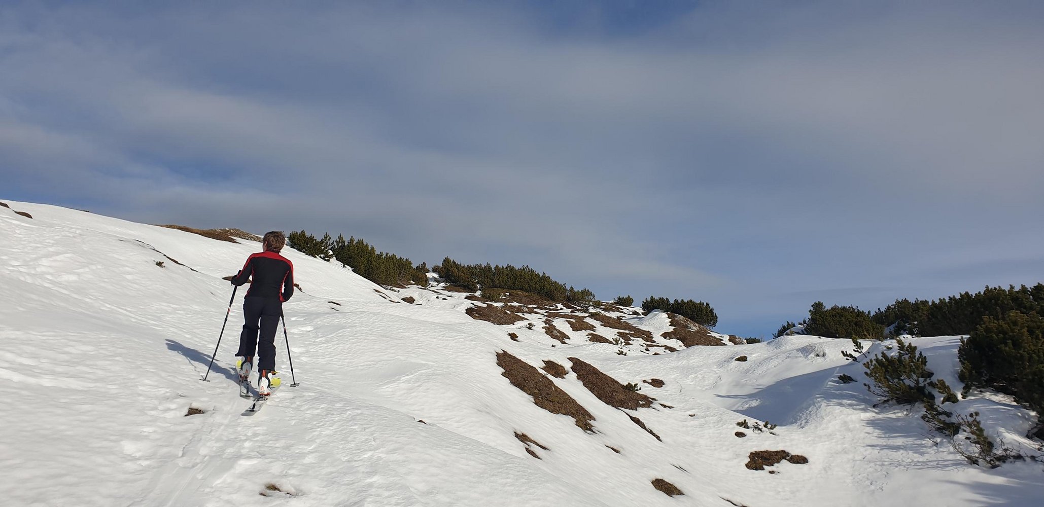Von der Gnadenalm anfangs flach auf der Forststraße zur Südwiener Hütte, wobei man nach dem ersten Flachstück auch über den Sommerweg abkürzen kann. Bei der Südwiener Hütte links und über einen etwas steileren Hang in eine flache Rinne, die in eine flache Scharte führt. Hier entweder ca. 50 Hm in eine große Grube abzufahren oder links, sehr lawinengefährd eine Hangquerung ohne Höhenverlust in die Grube vornehmen. Nach der Grube und einer Rinne kommt ein Rücken, der in die große Senke unter dem Gipfelhang führt. Im Gipfelhang hält man sich je nach Verhältnissen links in die Scharte hinauf und dann über den Grat oder oder knapp unter dem Grat direkt zum Gipfel. Event. Skidepot über der Scharte und weiter zu Fuß. Vorsicht auf Wechten am Grat.