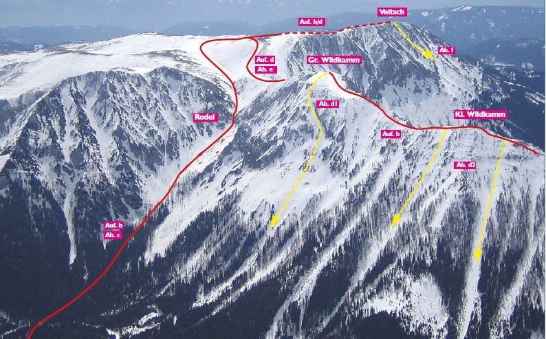 Vom Niederalpl (Passhöhe) geht es auf einem markierten Sommerweg, östlich in einem Bogen um den Sohlenkogel hinauf auf die Sohlenalm (1352m). Dann südlich, über den ausgeprägten Kamm, auf den Gipfel des Kleinen Wildkamms aufsteigen.