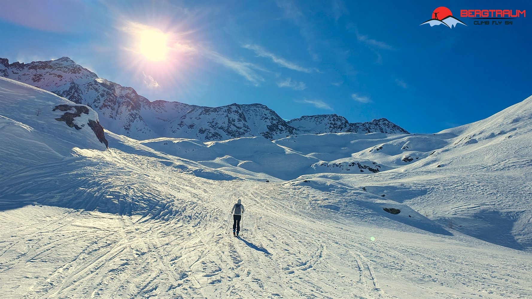 Abfahrt: Entlang der Aufstiegspur runter über herrliches Schigelände zum Ausgangspunkt retour. Oder über mittelsteile (max. 30°), nordexponierte Hänge zu den Montanalmen und weiter zur Staller Sattel Strasse auf Südtiroler Seite. Wieder auffellen und die Strasse rauf zum Ausgangspunkt zurück.
