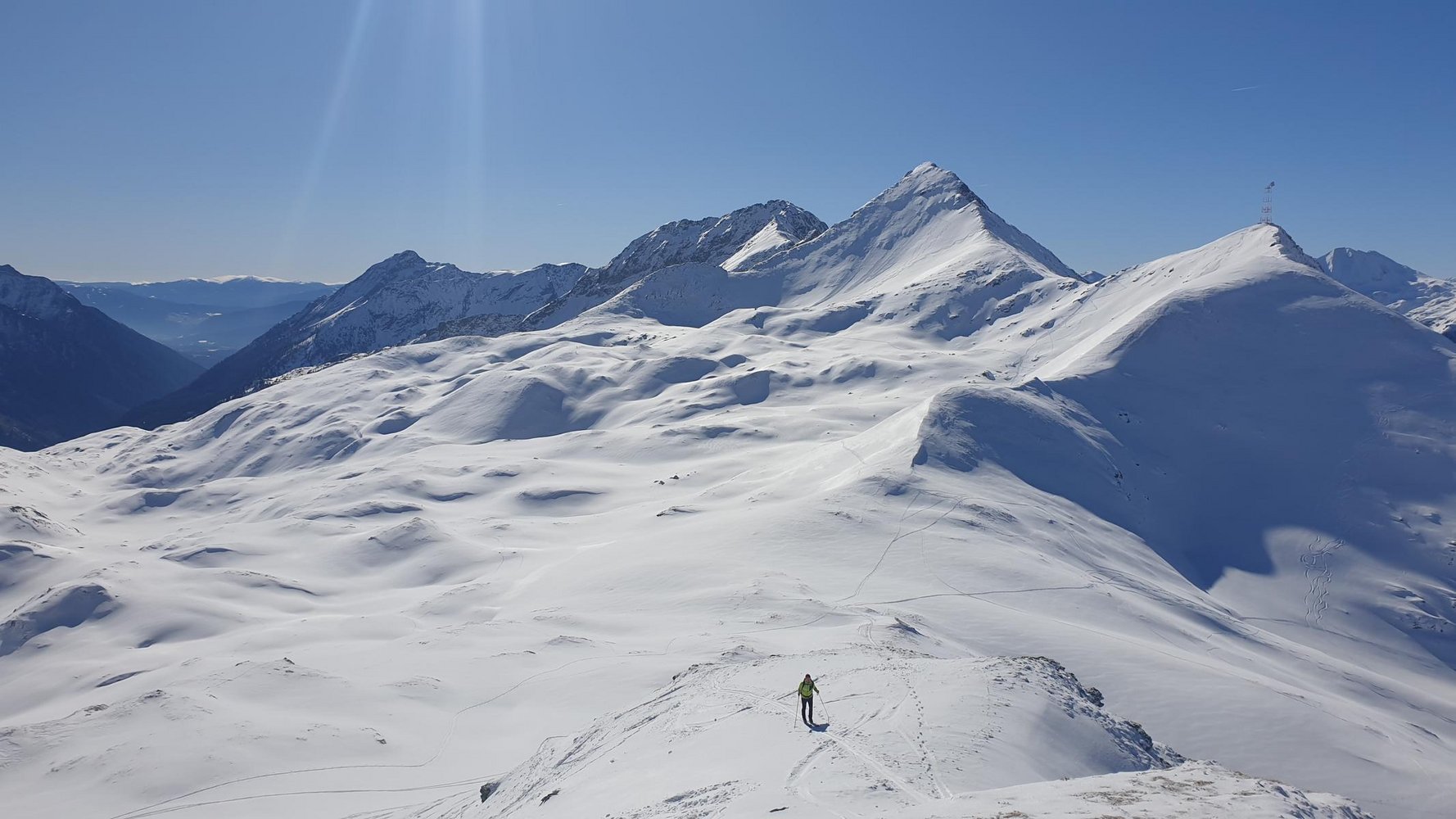 Im Skigebiet Obertaueren Skitourengehen? Ja, das geht, wobei man dem Ski-Rummel nur auf der Nordseite der Plattenspitze wirklich entkommen kann. Die von uns vorgestellte Gipfelrunde verbindet drei bis vier Skitouren-Gipfel zu einer bis zu rd. 16 km langen Skitouren Runde mit rd. 1650 Hm. Gestartet wir mit der Skitour auf die Seekarschneid - sie ist steil und nur bei sicheren Lawinenbedingungen möglkich. Es folgt eine Pistentour auf den höchsten Gipfel der Skitourenrunde, die Seekarspitze und die Abfahrt und der kurze Aufstieg zum Hundskogel. Das Finale bildet die Plattenspitze mit ihrer schönen Ostflanke oder der kurzen Abfahrt nach Süden zum Skigebiet.