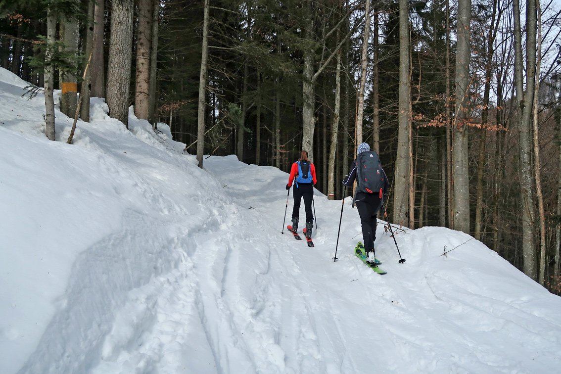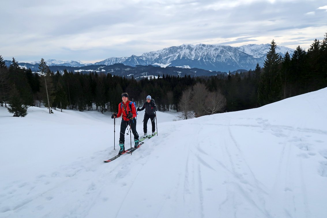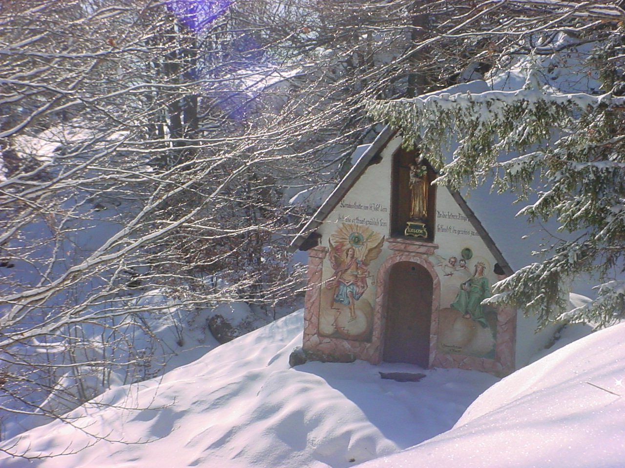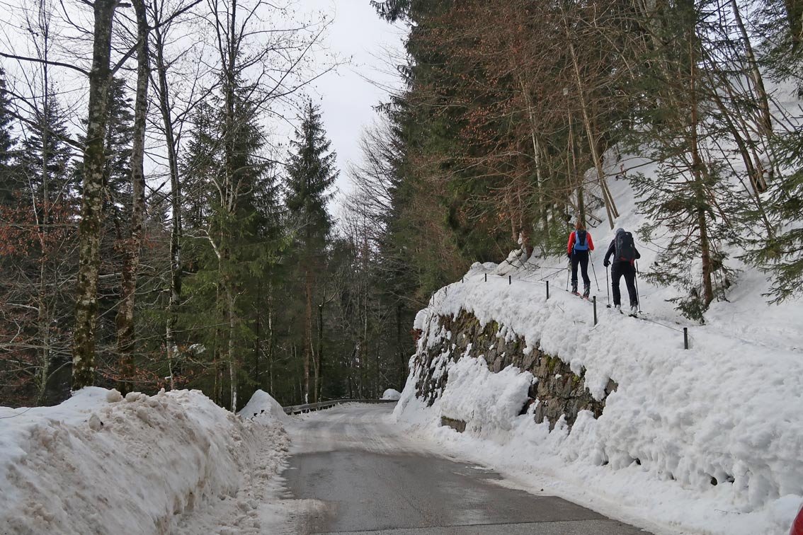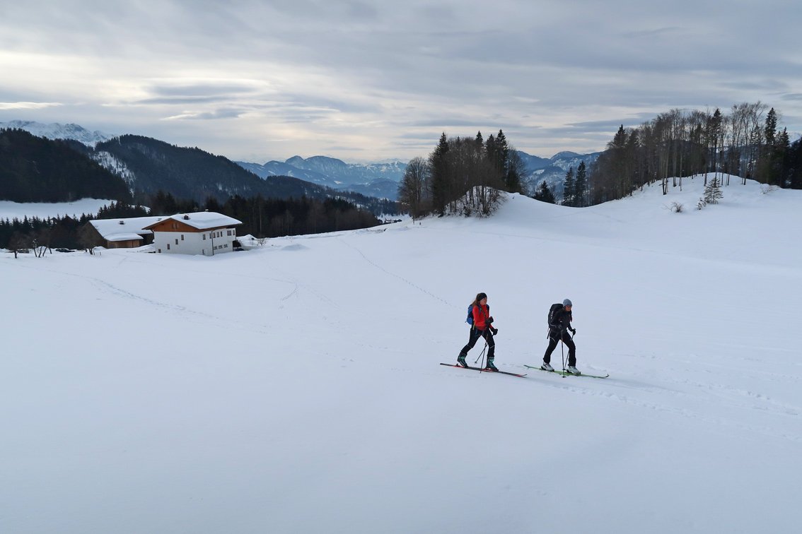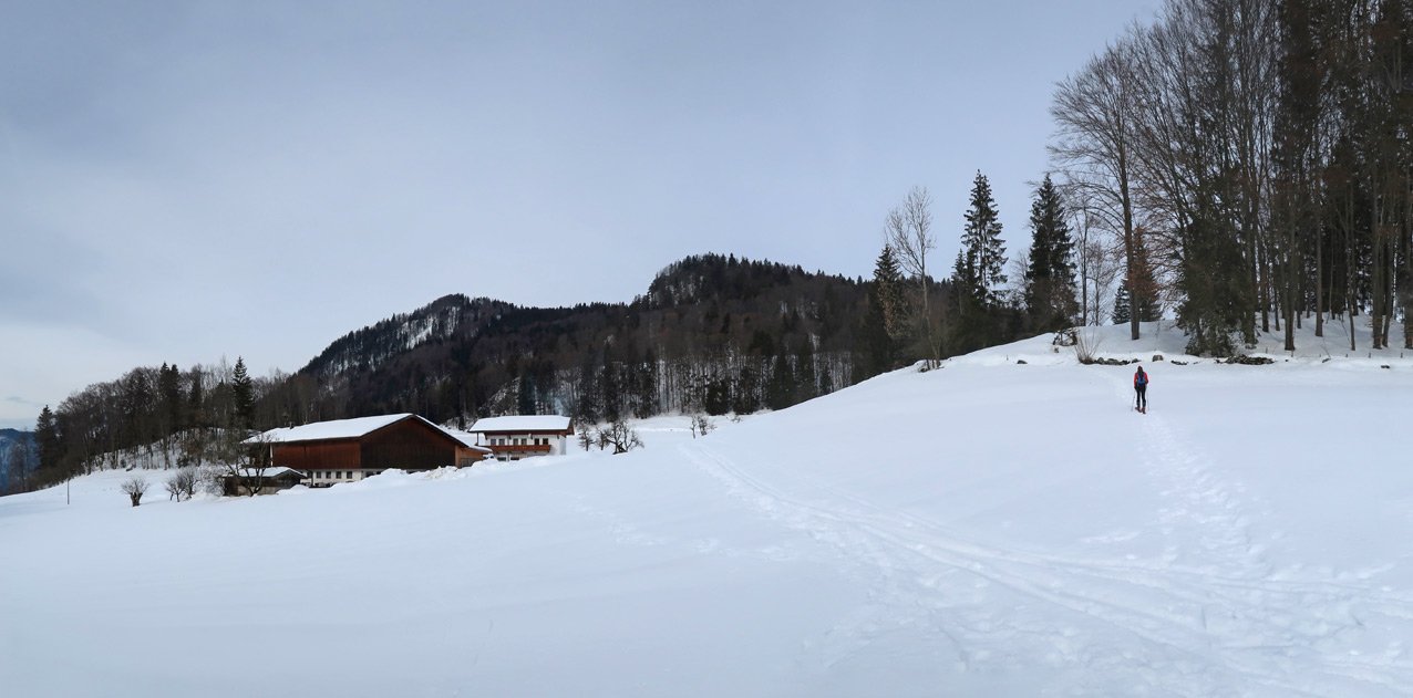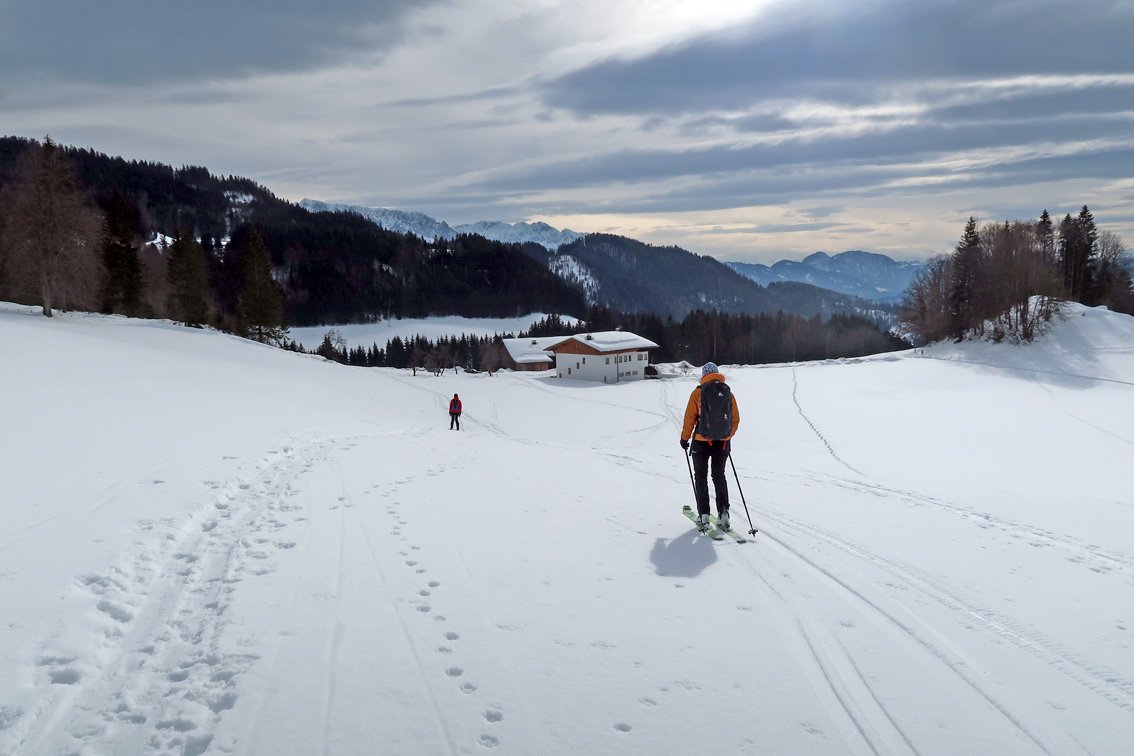 Sollte die Straße vereist sein, kann man auch von Erl aus zum Trockenbacherhof aufsteigen (ca. 270m/45min länger). Man folgt zuerst der Straße, dann kürzt man div. Kurven ab, oben dann rechts bzw. links davon über schöne Wiesen bis zum Trockenbacherhof.