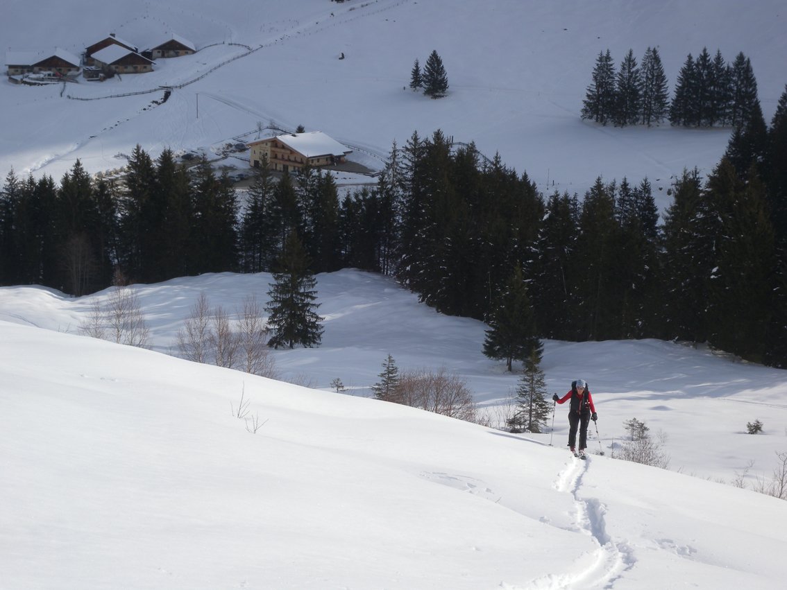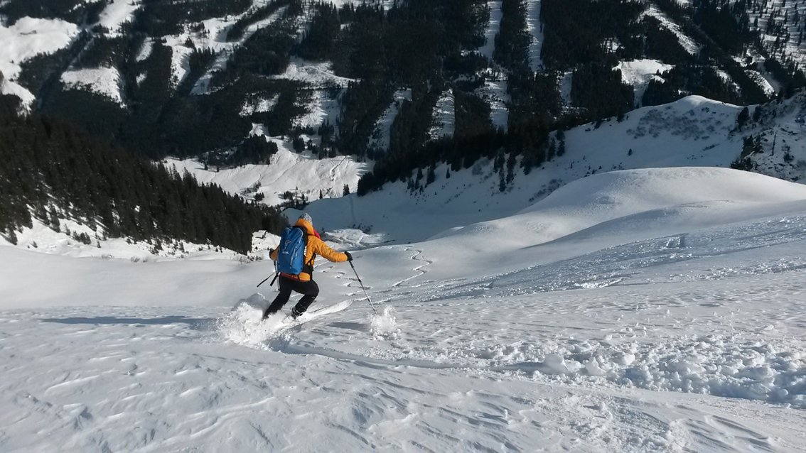 Abfahrt: Bei sicheren Verhältnissen fährt man das Kar zwischen Kleinen Beil und Lämpersberg ab. Unterhalb der Ascher Trettlalm folgt man einem markierten Steig zurück zur Loipe.