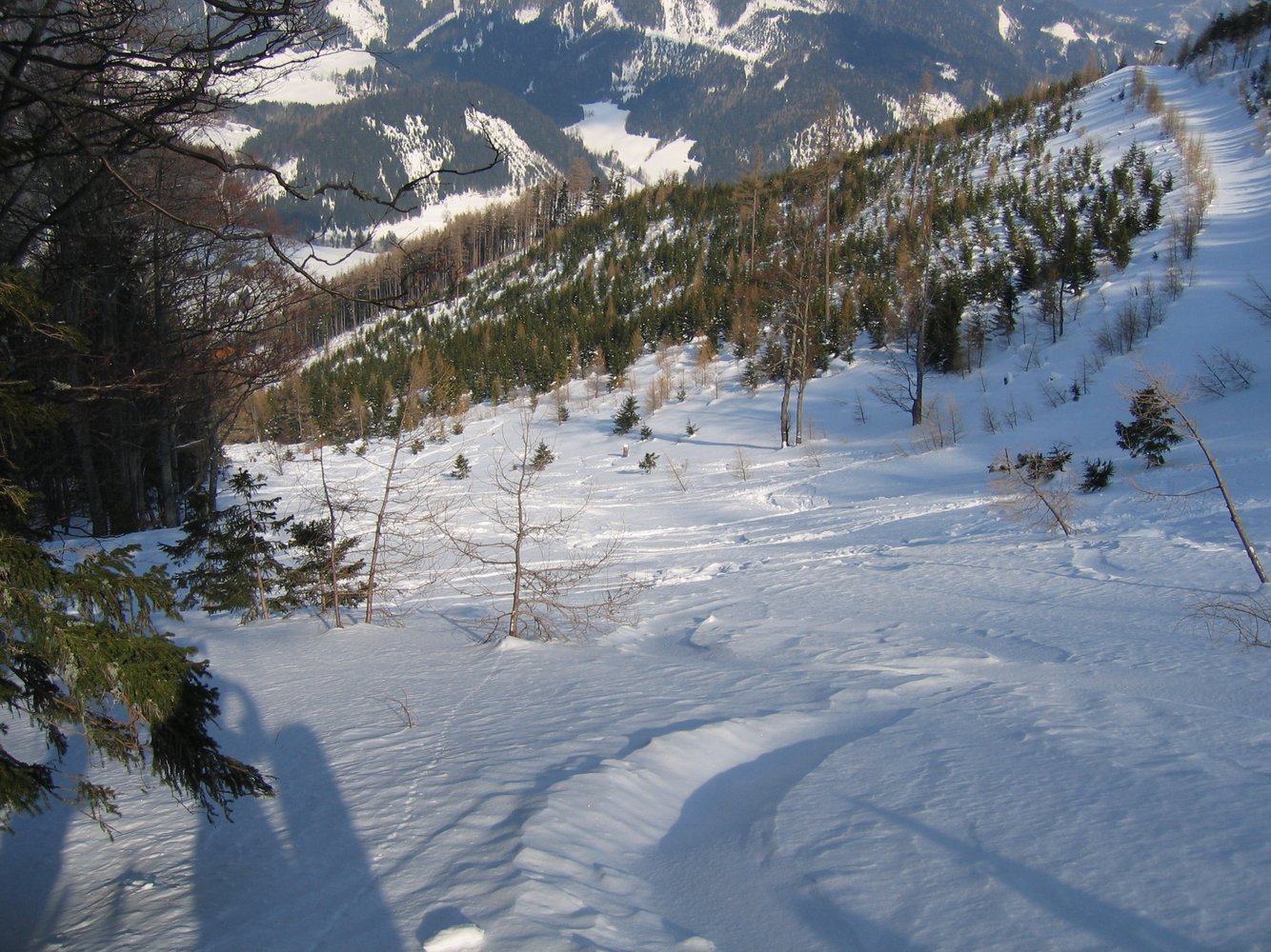 Ein echter Geheimtipp im Preintal. Der Graben und die lichten Wälder rechts und links davon bieten perfekten Pulverspaß. Im unteren Teil ist der Graben leider schon ziemlich zugewachsen.