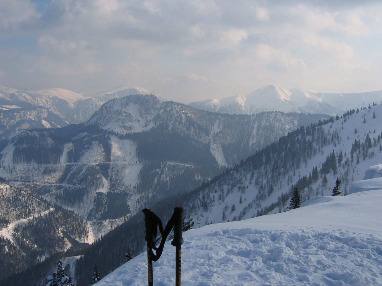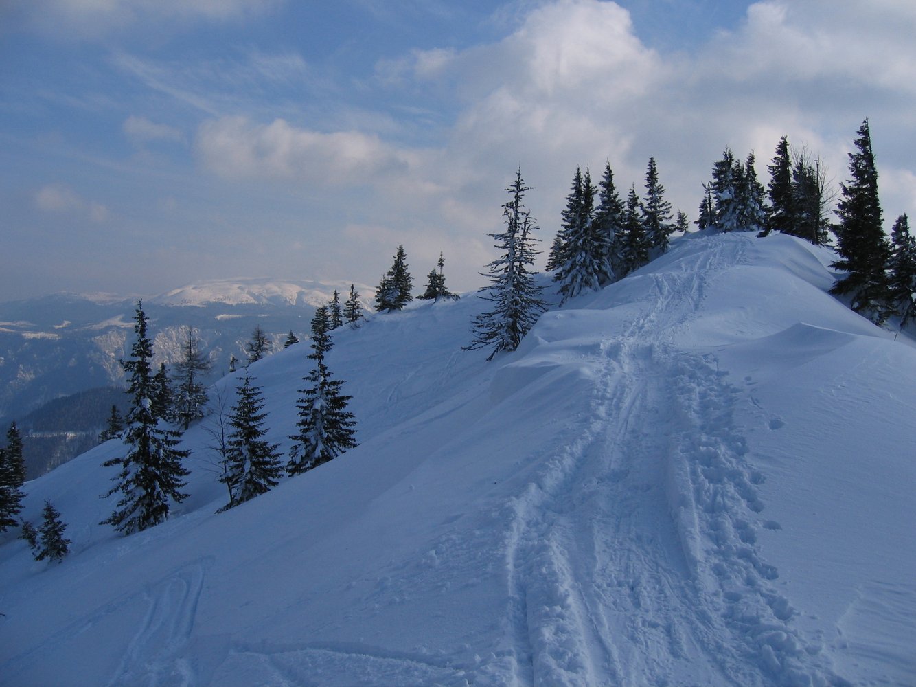a. Lahngraben: Beim letzten Haus links über die Brücke und danach rechts zum Lahngraben und durch diesen direkt zum Gipfel, vobei im oberen Teil Lawinengefahr herrscht. Hier kann man aber rechts auf den bewaldeteten Rücken ausweichen. Bei großer Lawinengefahr weicht man schon ganz untern bei einem Hochstand, wo eine Forstraße quert nach rechts auf den Rücken aus und folgt diesem bis zum Nordkamm, der dann zum Gipfel führt.