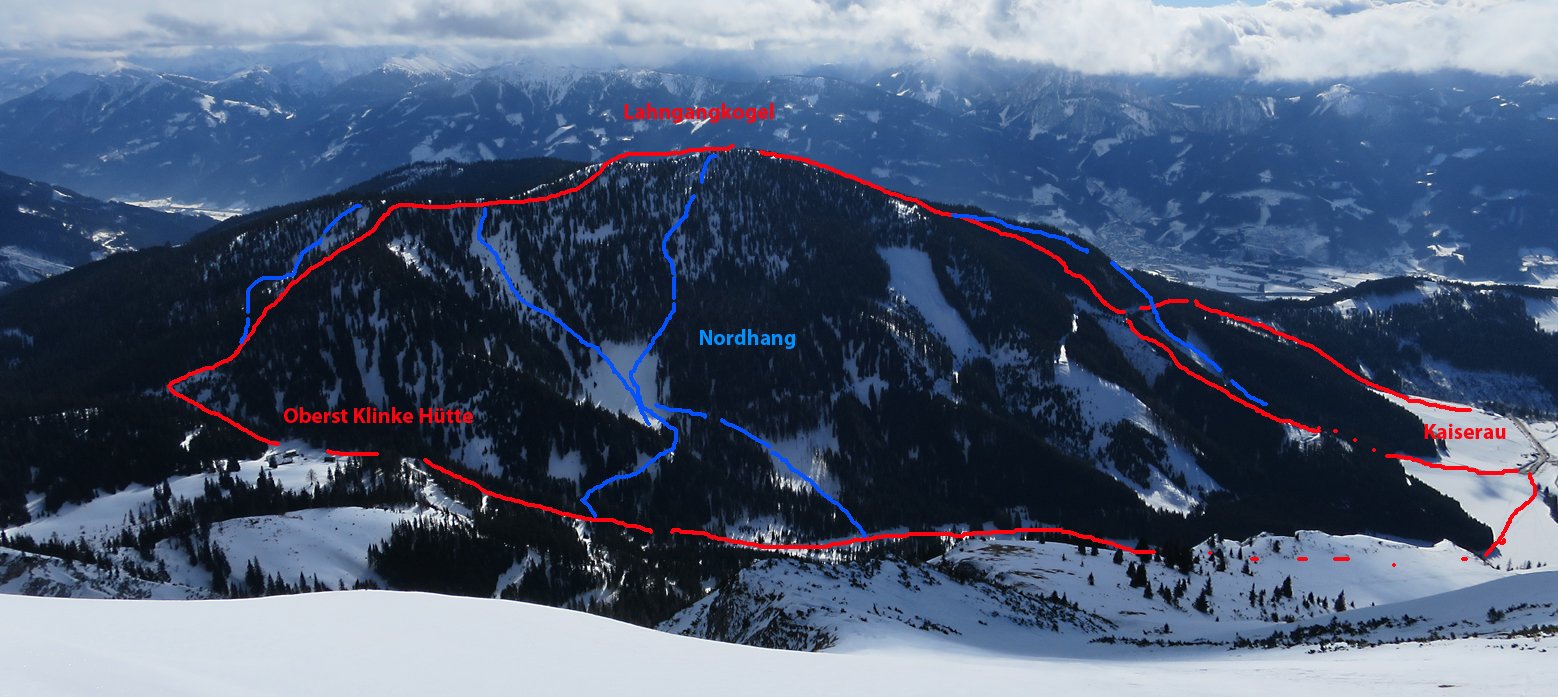 Abfahrt: Vom Höchsten Punkt dem NO-Grat folgen und zur Oberst Klinke Hütte abfahren. Von der Hütte die Serpentinen der Rodelbahn am Anfang abschneiden und dann auf der Rodelbahn zurück zur Kaiserau.