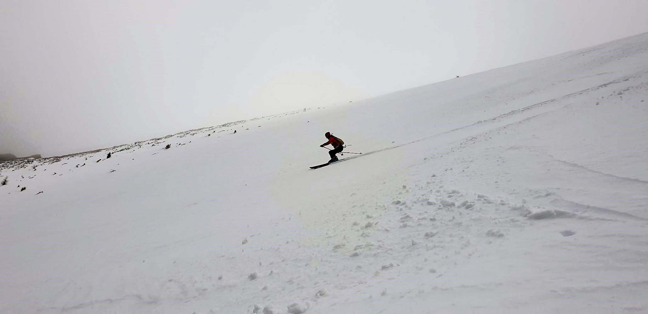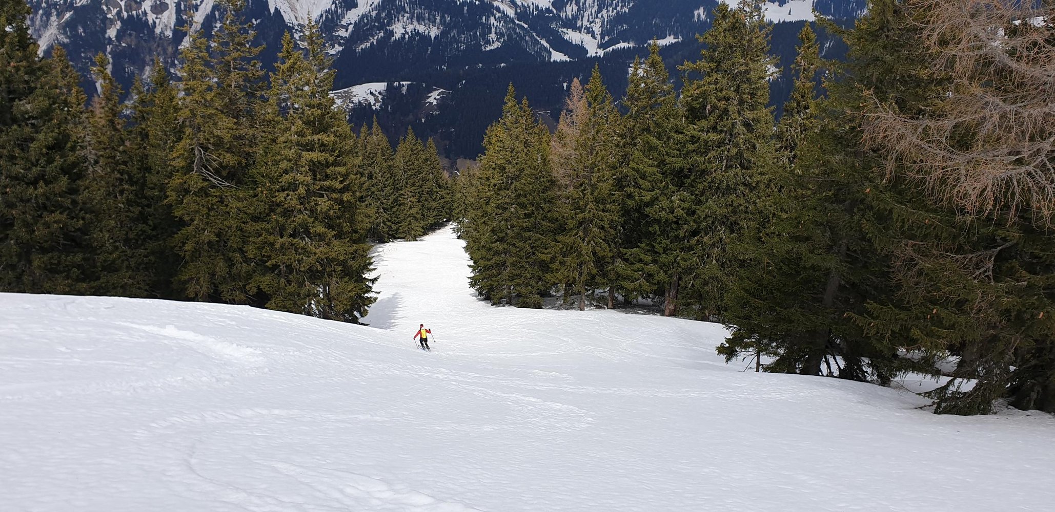 Abfahrt wie Aufstieg. Am Ende des Gipfelhangs entweder entlang der Aufstiegsspur zur Grössingeralm, oder links durch einen langen Schmalen Schlag zur Brunnfurtneralm, 1530 m und links hinunter zur Forststr. auf der die Skiroute zum Blaseneck verläuft und über diese rechts (sehr flach) zurück.