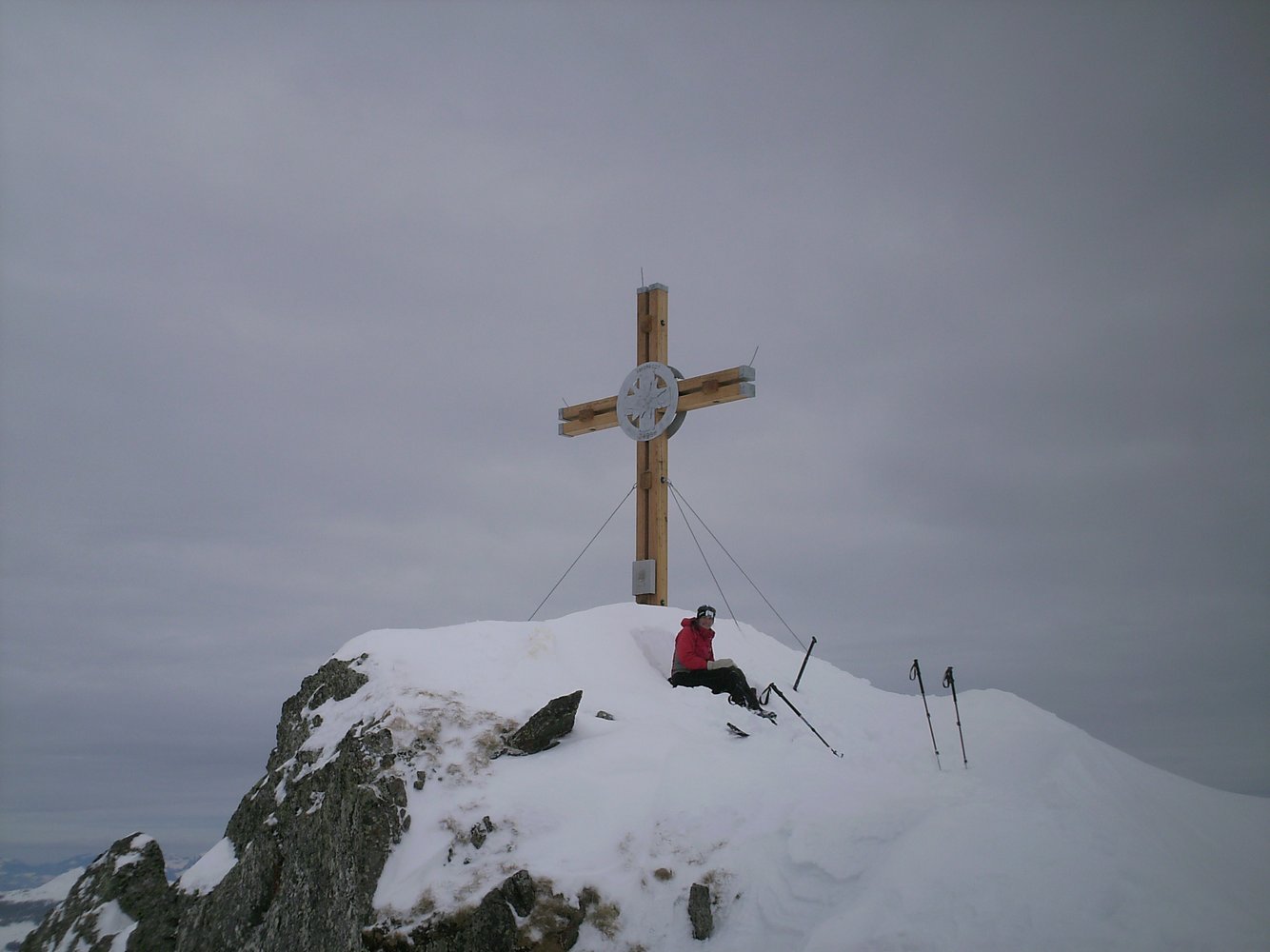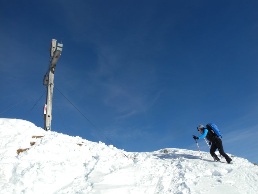 Wenn man den Gipfelblock rechts umgeht sollte man etwas aufpassen - dort ist es kurz sehr steil, diesen Hang nur bei sicheren Verhältnissen begehen. Alternativ auf dem Grat bis zum höchsten Punkt kraxeln.