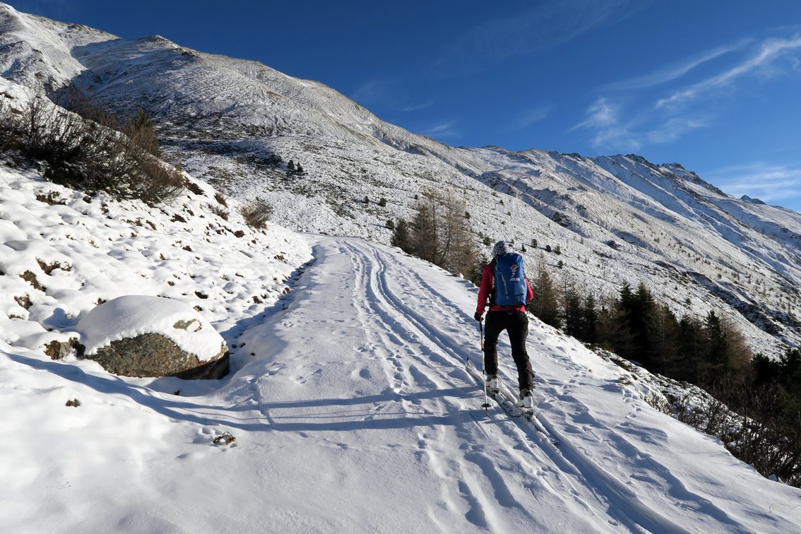 Achtung: Bei wenig Schnee beginnt man am besten am oberen Ende der Lawinengalerie. Man geht zuerst auf der Galerie ostwärts bis zu einer Forststaße, dieser folgt man dann ins Klammbachtal.
