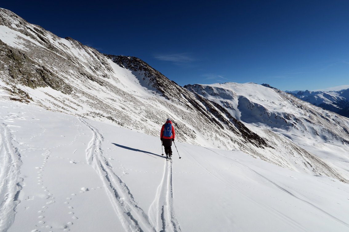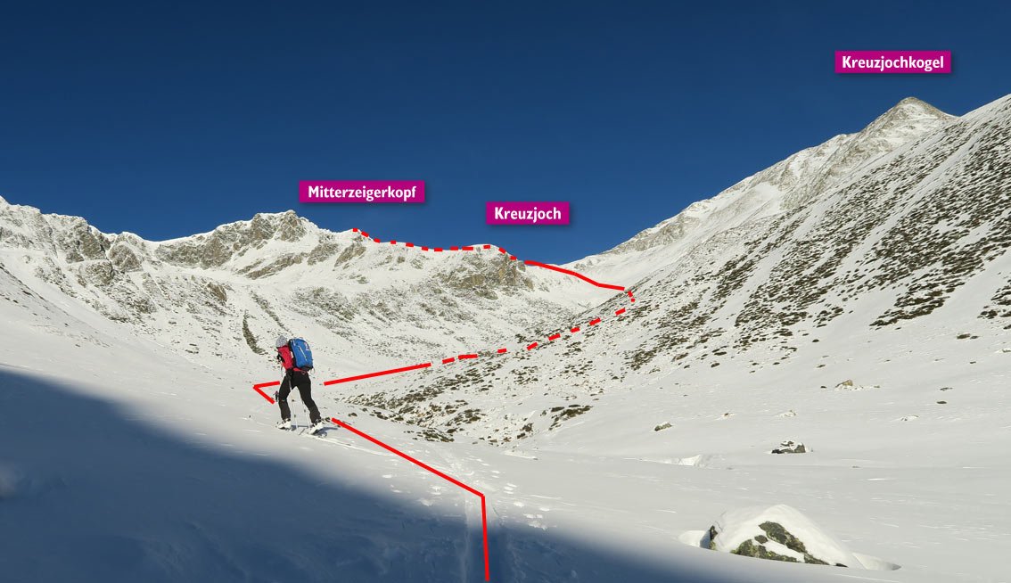 Der Mitterzeigerkopf ist die leichteste und kürzeste Tour mit dem Startpunkt "lange Lawinengalerie". Schöne Abfahrtshänge und ein leichter Gipfelgrat sorgen für Abwechslung. Vom Gipfel hat man eine schöne Aussicht ins Inntal und auf die Mieminger Kette. Wem der Gipfelgrat doch etwas zu unsicher erscheint, macht einfach beim Kreuzjoch den Endpunkt. Der Anstieg zum Mitterzeigerkopf ist eine der leichtesten Skitouren im Kühtai, deshalb ist diese Tour auch recht beliebt.