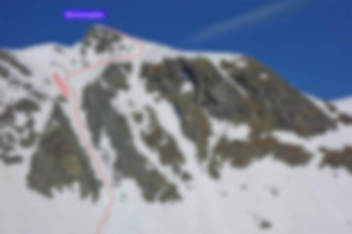 Abfahrt über die Ostrinne: Direkt vom Gipfel einige Höhenmeter auf einem kleinen Rücken nach Osten abfahren und bei der ersten Gelegenheit steil (45°) nach rechts in die Rinne queren. Dort zunächst 40°, nach unten hin nimmt die Steilheit wieder zu.