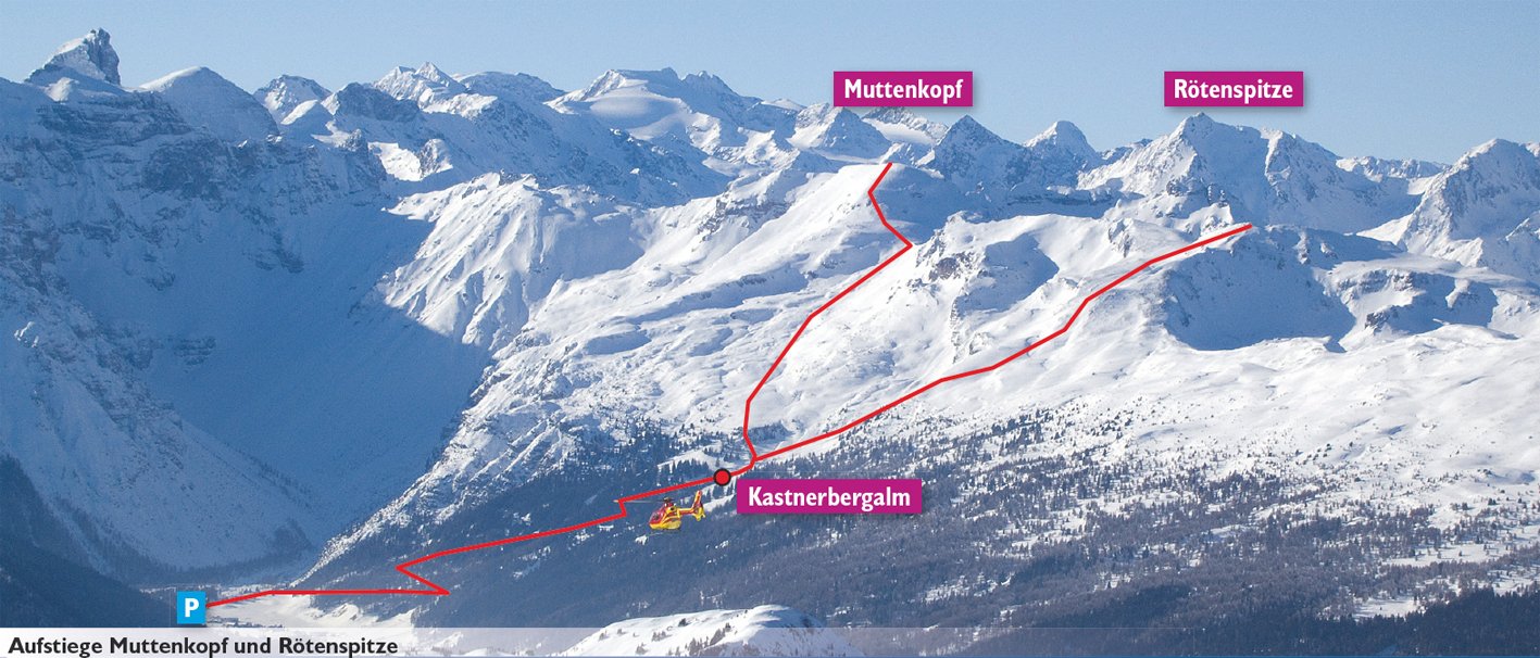Vom Parkplatz entlang der Straße in Richtung Nordwesten. Nach dem Waldbauer gelangt man zur Forststraße, die Richtung Nordosten zur Kastnerbergalm hinauf führt. Von der Kastnerbergalm geht man in Richtung Westen, entlang eines nur schwer erkennbaren Forstweges. Auf einer Höhe von 2000m erreicht man den Hochalmbereich Kastnerberg. Man folgt einer flachen Einbuchtung in Richtung Muttenjoch, kurz vor dem Joch wird es steiler. Auf dem Muttenjoch (2398m) geht man nach links und erreicht über einen steileren Abschnitt (steilste Passage der Tour) die runde Gipfelkuppe mit dem großen Kreuz.