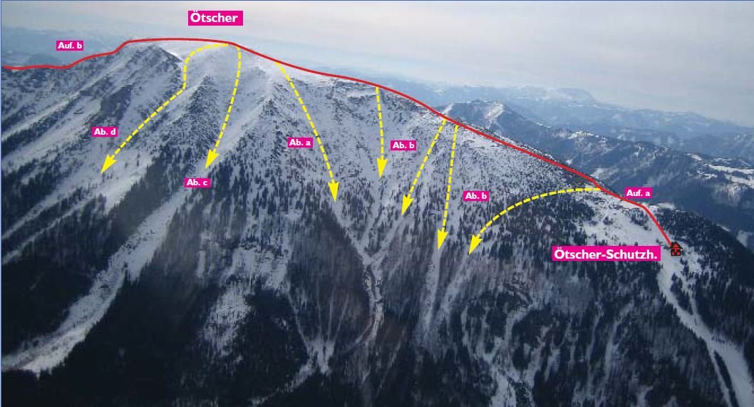 a) Fürstenplan (1050 Hm/II): Klassische und beliebte Flanke, in die man direkt vom Gipfel nach Westen einfährt. Die Flanke wird im unteren Teil enger und erreicht beim Bergl eine Forststraße, der man nach Lackenhof folgt. Variante Direktabfahrt (III): Vom Gipfel etwa 400 m über den Kamm nach Westen und links, steil in die Flanke einfahren.