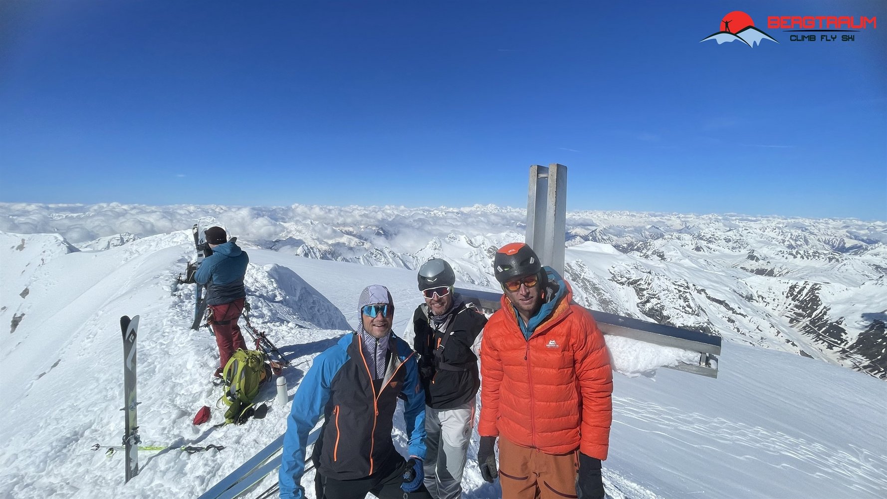 Ausrüstung: Skitourenausrüstung, Lawinenzeugs, Steigeisen, Pickel.