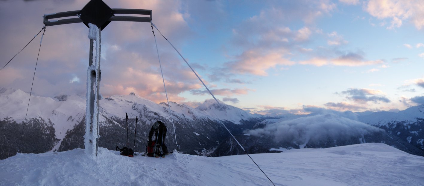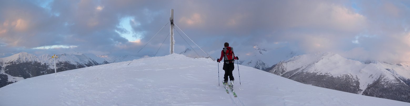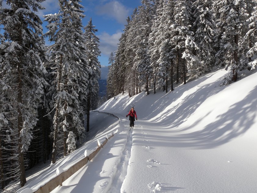 Die Aufstiegsroute ist flach und hat keine Hänge die über 35° steil sind, somit eine gute Tour bei angespannter Lawinensituation. Die Abfahrt über die Westflanke ist aber am Anfang steil, dafür benötigt es sichere Schneeverhältnisse!