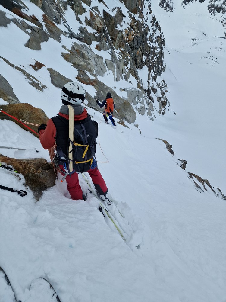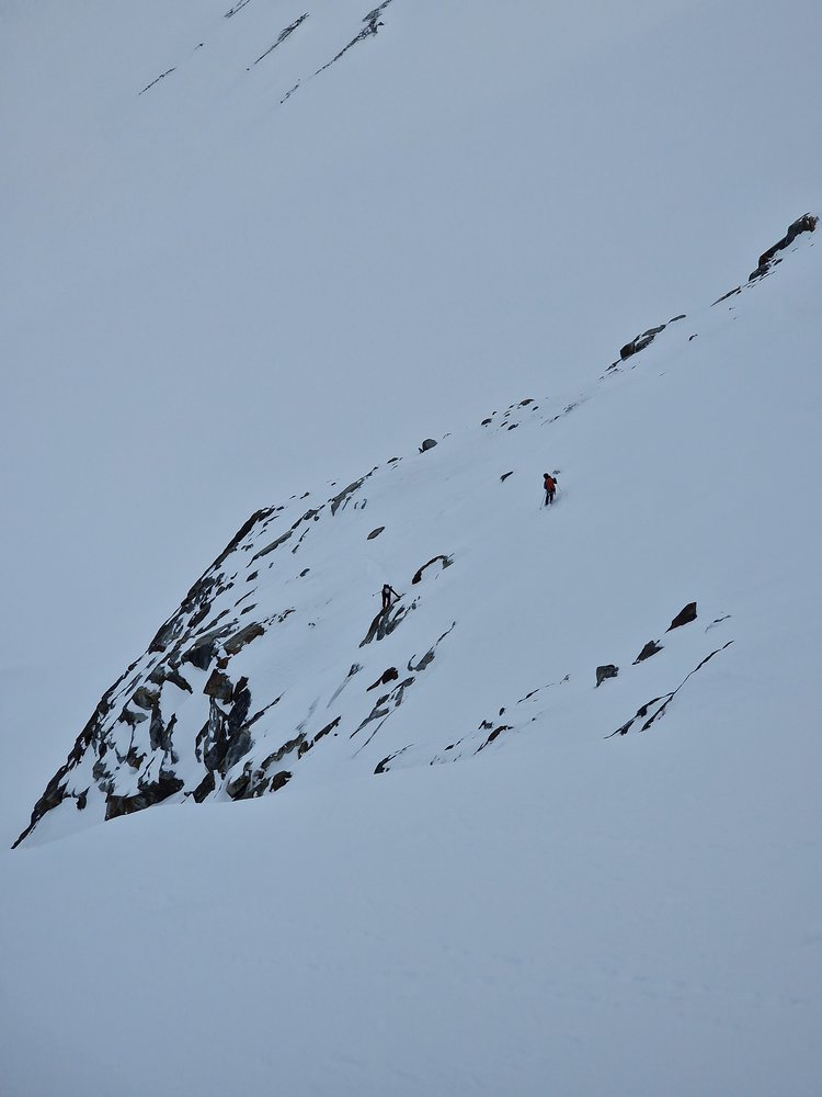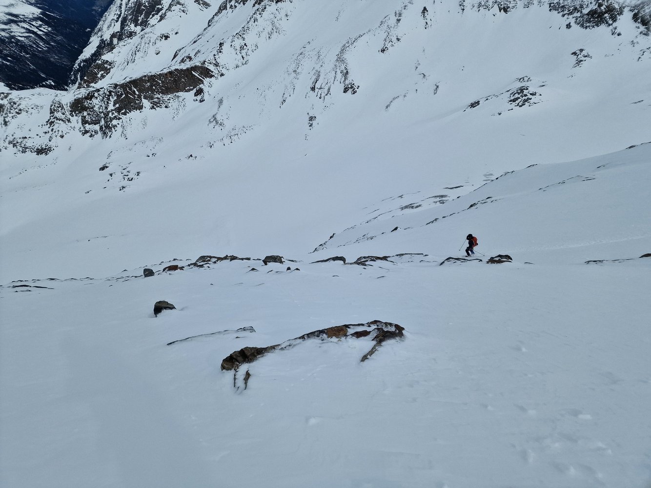 Exponiert! Das Skifahren ist nie schwierig, im Allgemeinen 35°, in den steileren Abschnitten ~40°. Allerdings gibt es in der Falllinie bis zum Ende Klippen. Konzentration ist erforderlich. Warte unbedingt auf sichere Bedingungen. Aufgrund der Felsen würde eine Lawine höchstwahrscheinlich zu einer fatalen Situation führen.