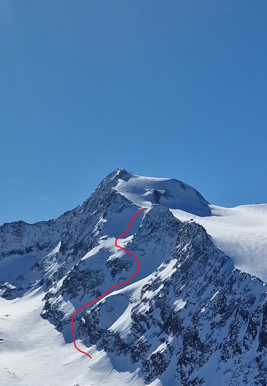 Aufstieg wie bei den klassischen Skitouren zum Zuckerhütl oder Wilden Pfaff. Vom Gipfel des Wilden Pfaffs fährt man nach Norden, bis man ein flacheres Gebiet erreicht, wo rechts ein großes Schneefeld steil abfällt. Fahr diese runter, aber nicht zu weit, sonst verpasst man die Querung! (Es gibt eine zweite Möglichkeit etwas weiter unten, die steiler und ausgesetzter ist), Nach der Querung befindet man sich in einem schüsselförmigen Schneefeld. Fahr sofort, wenn es geht, rechts raus (wo die untere Querung endet) und dann gerade hinunter, um den Ausgang der Linie zu erreichen. Je nach Verhältnissen kann man mit den Skiern abfahren, droppen, oder sich abseilen, um einen Kegel zu erreichen, der zum Gletscher führt. Von hier an ist es selbstverständlich. Man fährt bis zum See am Ende der Sulzenauferner u. Fernerstube Gletscher ab und quert das über das Peiljoch (kurzer Gegenanstieg 170 Hm) zurück ins Skigebiet.