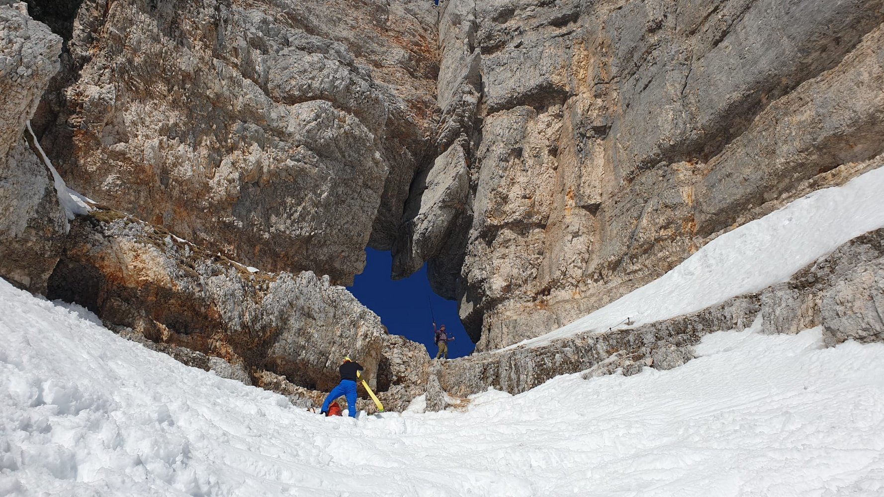 2. Von der Bergstation Sella Laupa hinunter zum Prevala Sattel, 2067 m und auf der Südseite weiter auf slowenischer Seite zur Zwischenstation des stillgelegten Sesselliftes auf einem Sattel (2280 m). Hier zwei Möglichkeiten: Hinter der Zwischenstation unter dem Lift durch und den Hang zwischen Felswänden zum Fenster queren, oder (empfohlen da sichererer) rd. 400 Meter nach Süden hinunter zur Einstiegsstation des Sessellifts zu fahren und die Hänge oberhalb davon zur letzten Rinne unter dem Fenster queren. Durch die Rinne hinauf zum Prestreljenik-Fenster auf 2380 m. Je nach Schneelage macht man ca. 40 Hm vor dem Fenster ein Skidepot und steigt zu Fuß auf.
