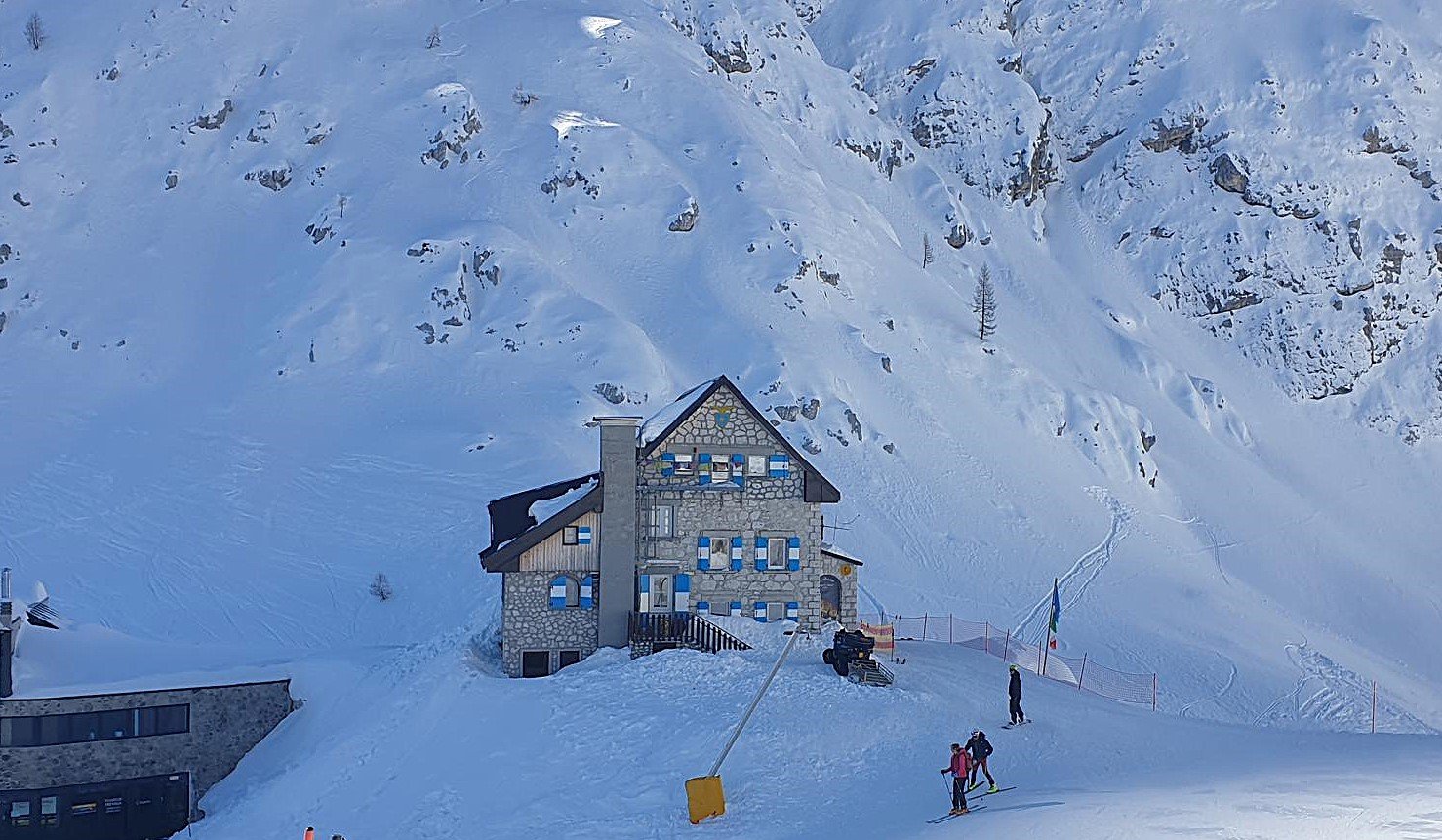 Von hier Auffahrt mit der Seilbahn zum Rifugio Gilberti. Nach der Skitourengeherkarte (2025 10,- Euro) fragen!