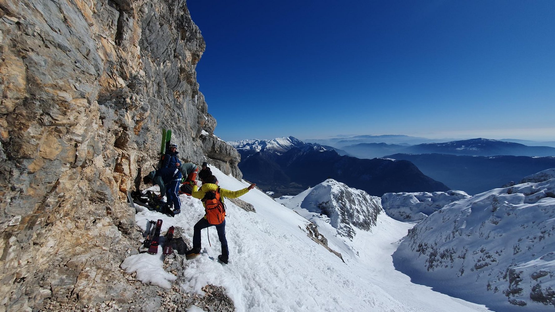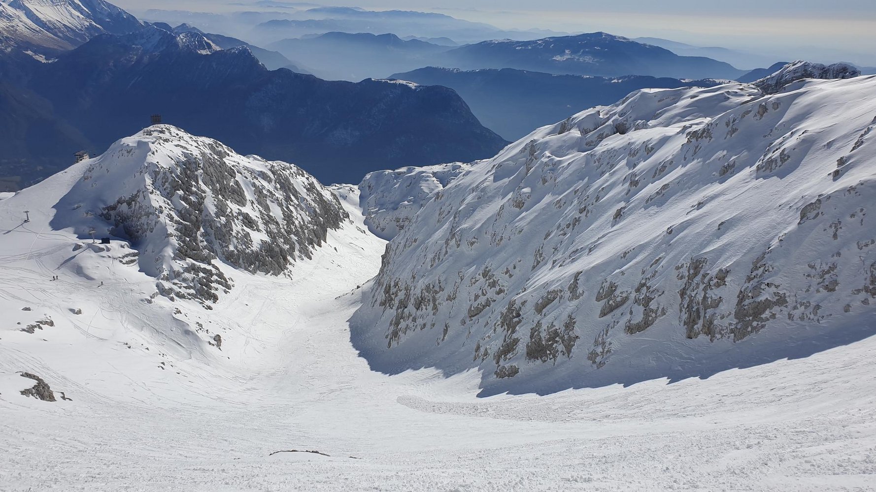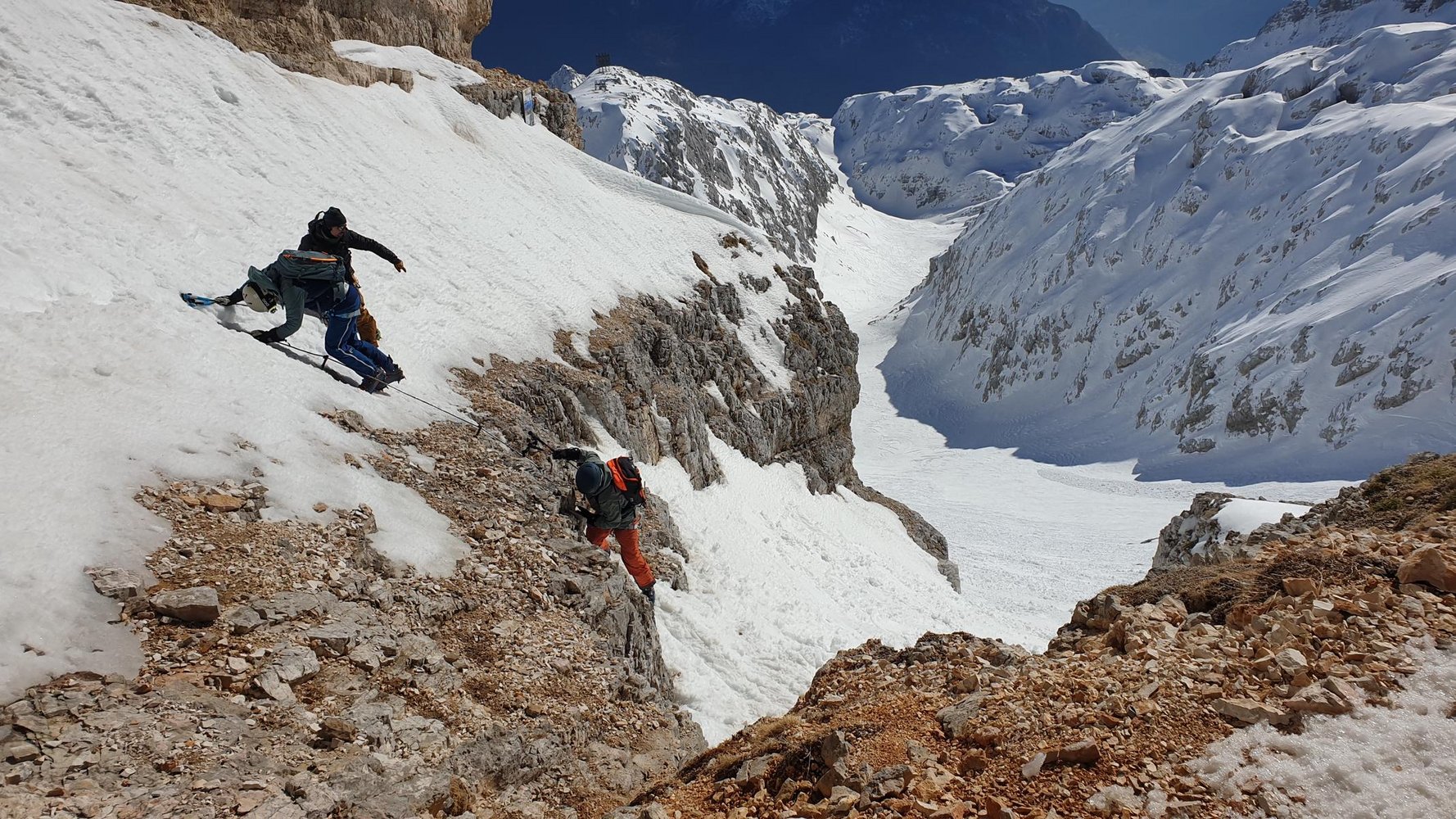 1. Von der Bergstation beim Rifugio Gilberti auf 1850 m über die Skitourenspur zum Prevala Sattel und weiter auf slowenischer Seite um den Prestreljenik herum bis zum Prestreljenik-Fenster. (800 Hm).