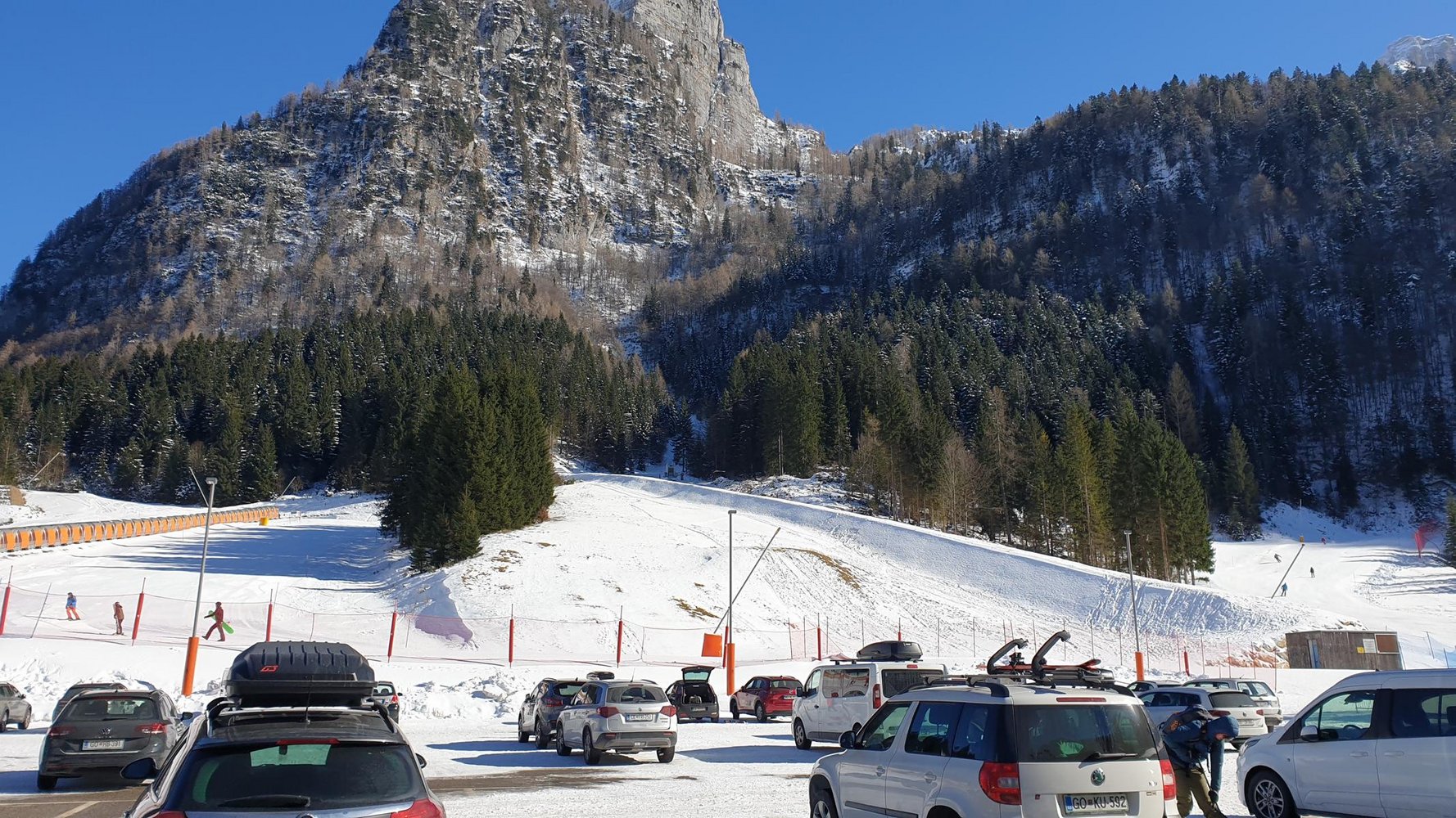 Von Tarvis: über die SS 54 nach Cave del Predil (Raibl) Richtung Predilpaß. Nach Cave del Predil an der Kreuzung beim Raibler See rechts abbiegen und über die SP 76 nach Sella Nevea. Im Zentrum des kleinen Ferienorts befindet sich nach den langgezogenen Hotelkomplexen der Parkplatz des Skigebiets. Hier parken. Aus dem Kanaltal: Bei Chiusaforte ins Raccolanatal einbiegen und über die SP 76 nach Sella Nevea.