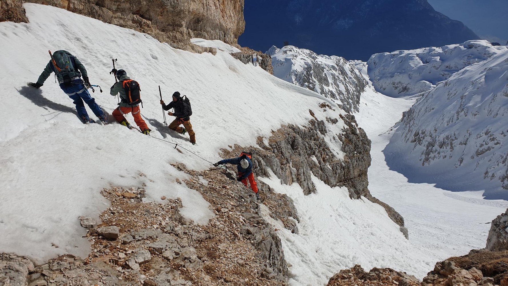 1. Von der Bergstation beim Rifugio Gilberti auf 1850 m über die Skitourenspur zum Prevala Sattel und weiter auf slowenischer Seite um den Prestreljenik herum bis zum Prestreljenik-Fenster. (800 Hm).