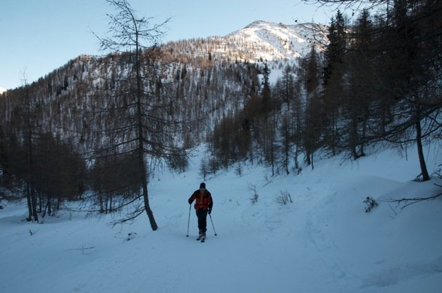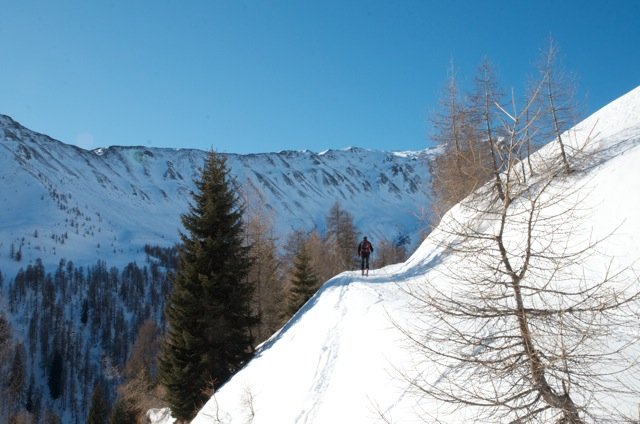 Vom Parkplatz gerade hinter in das langgezogene Tal den Skispuren folgen. Bei den Almen vorbei geht man über eine kleine Brücke. Hier folgt man dem Bach noch ein paar Minuten Richtung Gaishörndl / Toblacher Pfannhorn hinein, bis rechts ein Forstweg den Hang retour hinauf führt. Diesen folgen bis man bei kleinen Almen vorbeikommt. Hier dem Weg noch etwas folgen und dann den Hang hinauf bis zur kleinen Zollhütte. Dann noch den Grat entlang bis zum Schlusshang folgen.