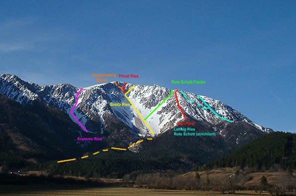 c) Vom Schneebergdörfel: Nur im späten Früher bei Firn und wenig Schnee zu empfehlen: Gleich hinter dem Bauernhof geht rechts ein gelb markierter Weg (Schild) zur Breiten Ries ab diesem folgen.