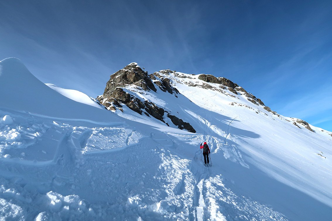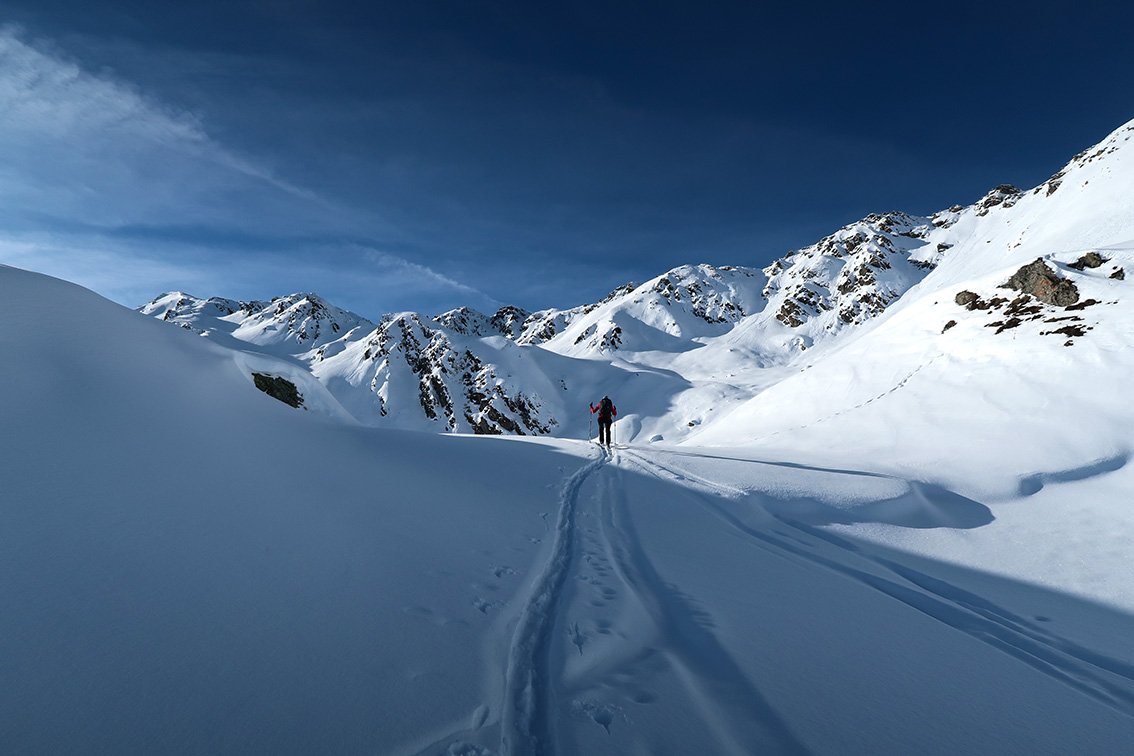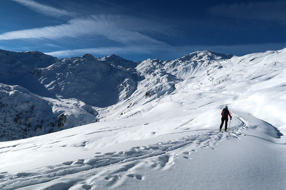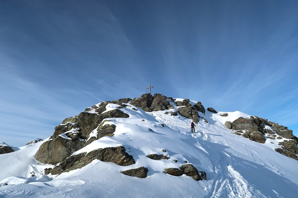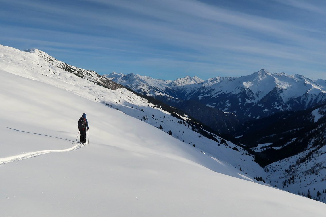 Beliebter Aufstieg von der Zillertaler Höhenstraße auf den Paradeskiberg der Tuxer Alpen. Die Tour hat nur in der Mitte und am Ende eine steilere Passage und ist über weite Strecken recht flach - mit kurzen Gegenanstiegen beim Rückweg.