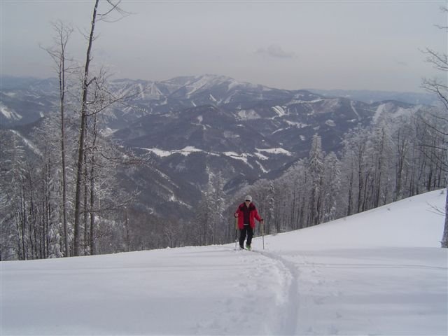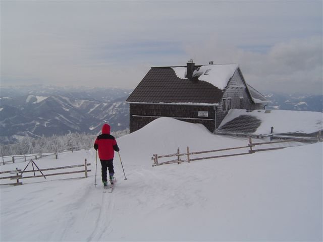 Den Graben hinein bis man zu kleinen Almhütten gelangt, nun scharf rechts ueber die Forststrasse und ueber die Zeisslalm zur Kleinzeller Hinteralm (Weiterweg wie oben), oder bei den Almhütten gerade weiter, bald rechts ueber den Bach auf der Forststrasse zur Hinteralm.Und weiter ueber die Almwiesen und den Sommerweg (immer gespurt), zuletzt ueber einen steileren Hang auf die Gipfelhochfläche. Vorbei am Bundesheerstützpunkt und gleich zum Reisalpen Schutzhaus (neuer, gemütlicher Winterraum). oder (hin und wieder gespurt) statt ueber den Bach gerade den Graben weiter steil und mühsam rechtshaltend hinauf: Dies ist die anstrengendste Variante, man kommt dafuer schon oberhalb der Almwiesen der Hinteralm heraus. Wer sich nicht verlaufen will, bleibt lieber auf einer der Forststrassen...