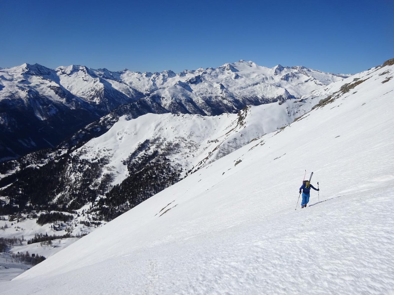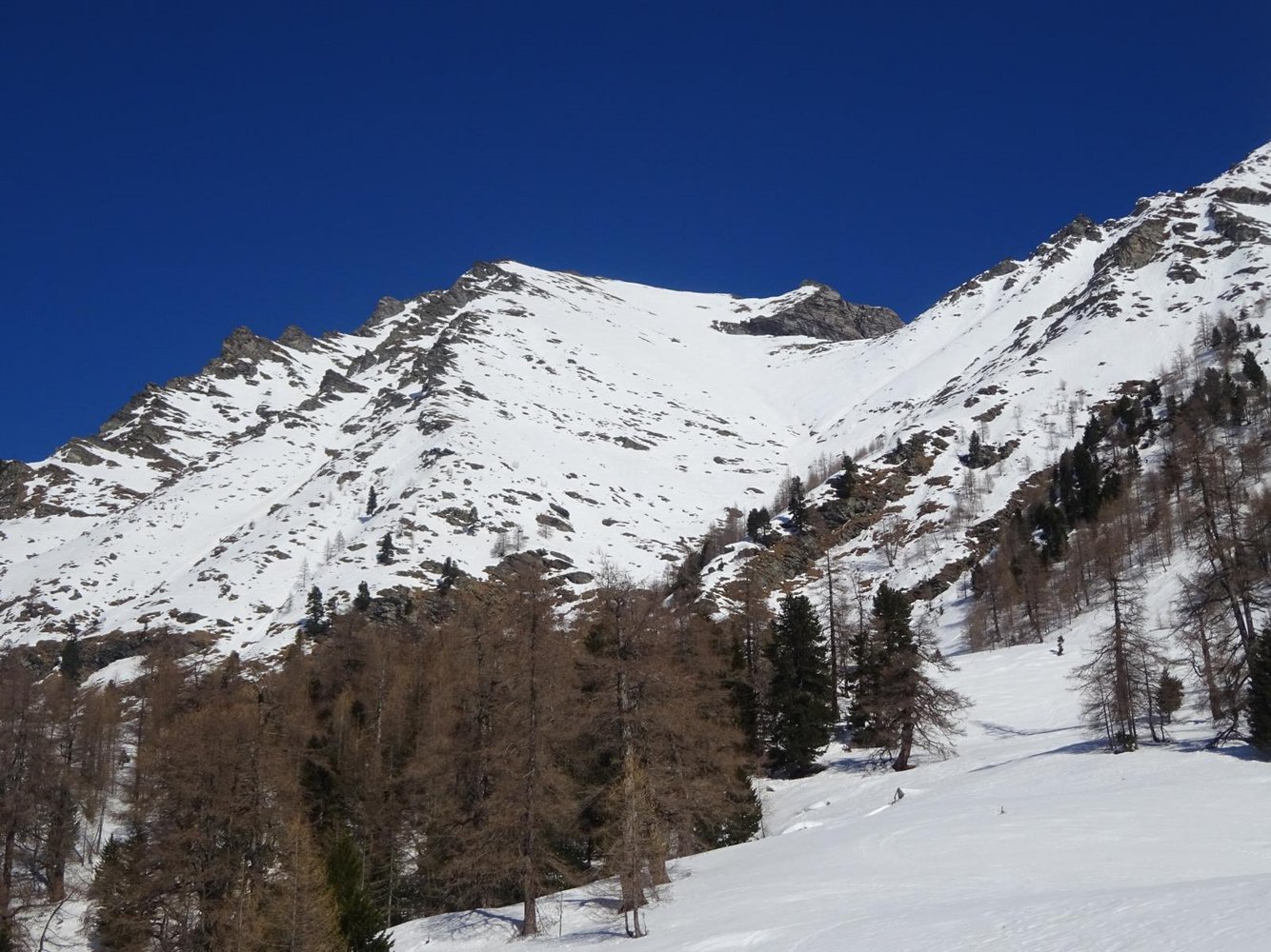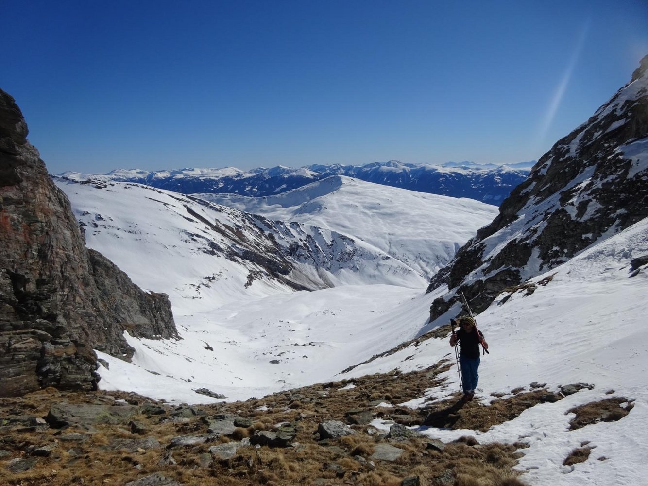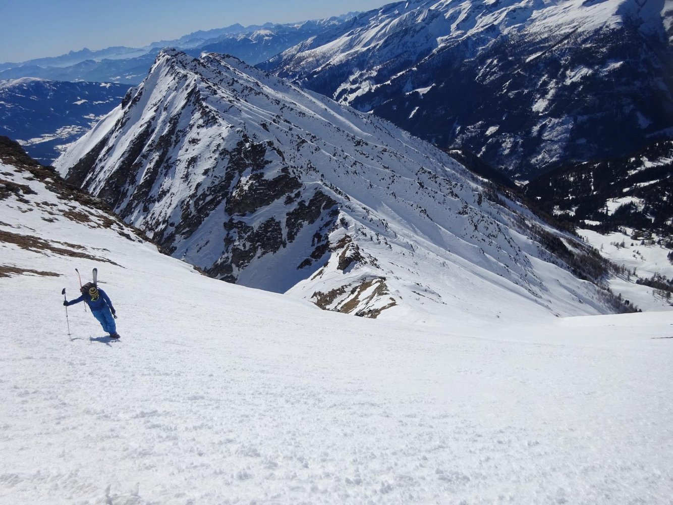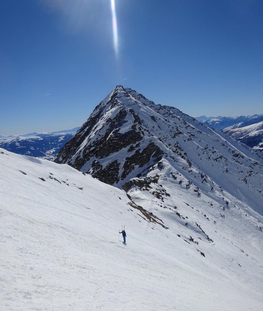 Abfahrt: Vom Vorgipfel über die zunächst weite südwestseitige Flanke hinunter Richtung Perschitz. Auf einer Höhe von etwa 2150m, wenn die Flanke eng wird und der Bach ansetzt, sollte man rechts herum (quasi um dein Rücken) oder links um den Lärchenriegel fahren, da der Bach eine Eisstufe besitzt. Anschließend flach Richtung Hütten, wo man oberhalb dieser auf die Forststraße trifft. Hier anfellen und leicht aufwärts (2 mal Kehren nach oben) aus dem Tal hinaus. So gelangt man zum Fauschauner Törl (1791m). Hier kann man dann wieder abfellen und Richtung Parkplatz fahren.