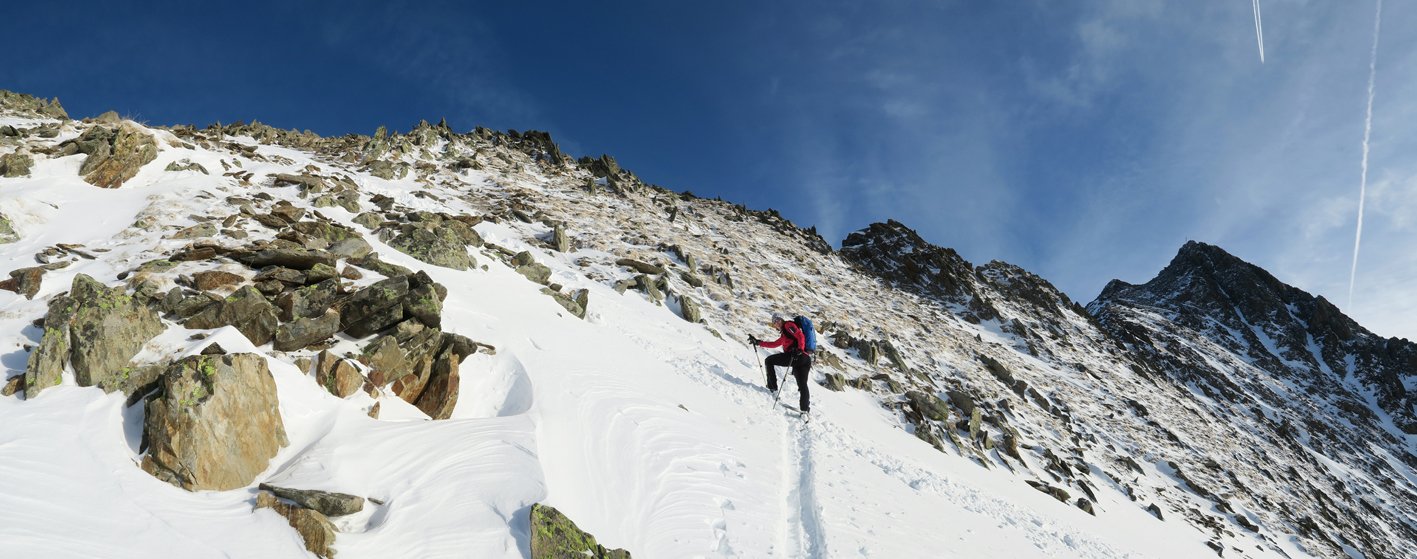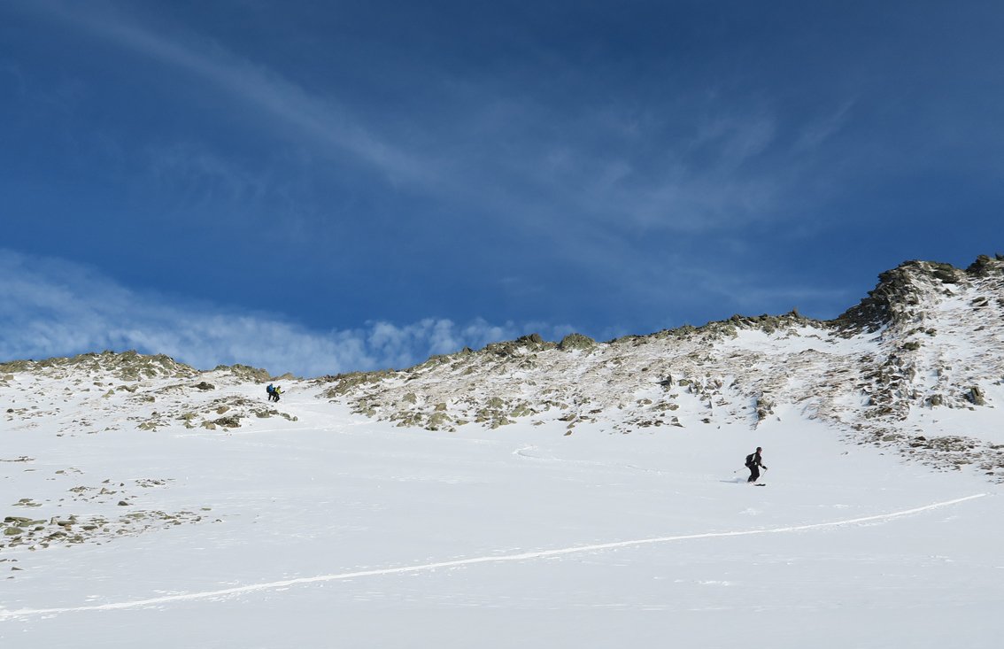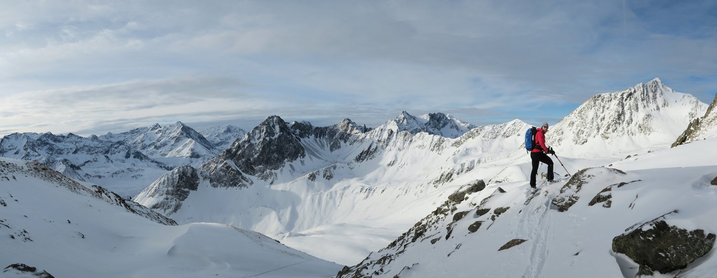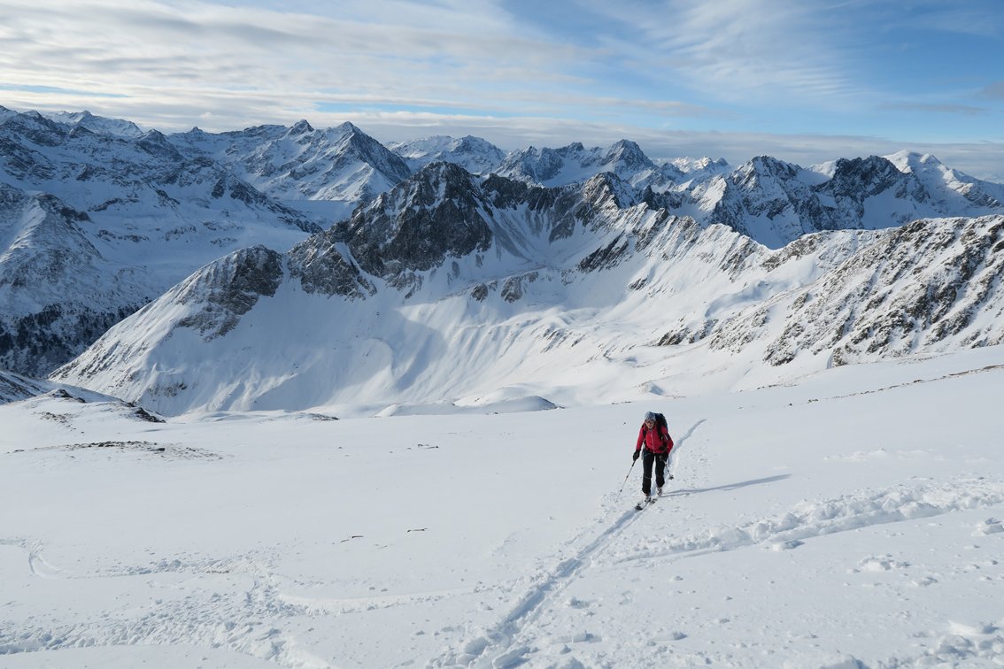 Der Rietzer Grieskogel ist einer der Klassiker im Kühtai, selten ist man alleine unterwegs. Bis auf den kurzen Steilhang nach den Narrenböden und dem rechts und links steil abfallenden, aber breiten Gipfelgrat ist die Tour leicht. Schöne Abfahrtshänge und ein schöner Gipfelgrat sorgen für Abwechslung. Toller Blick vom Gipfel hinunter nach Telfs und die Mieminger-Kette. Wer den Gifelgrat nicht machen will (bei Schneemangel oder wegen Überwechtung) lässt es in der Scharte gut sein.