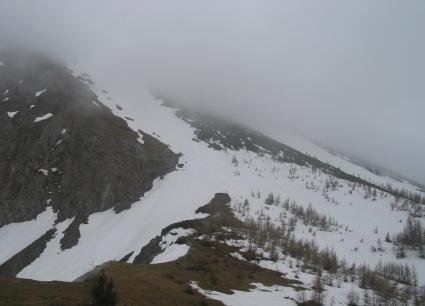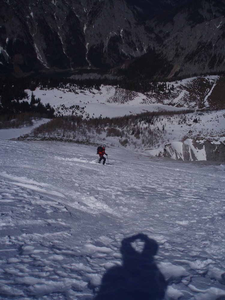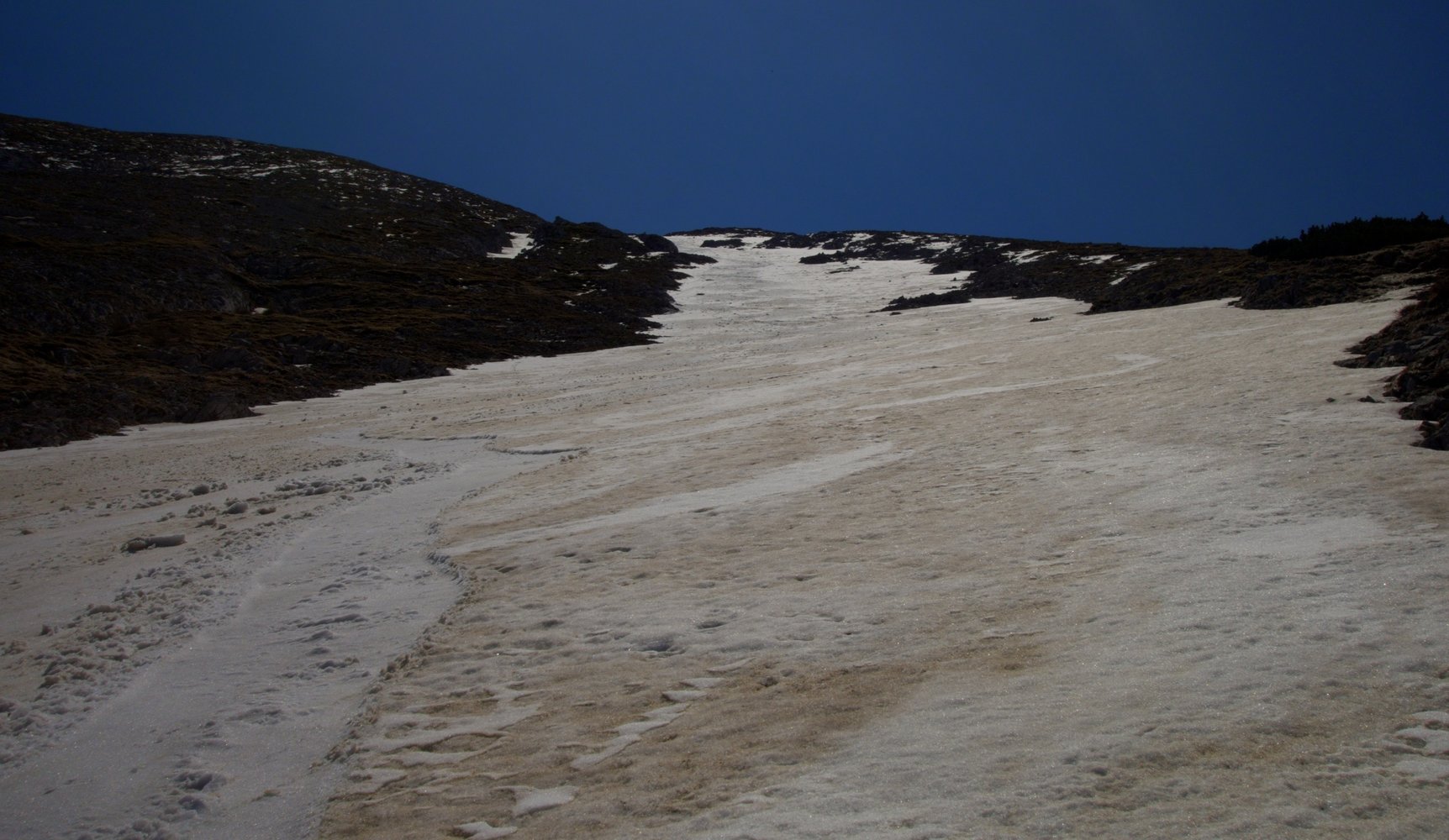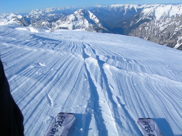 Abfahrt wie Aufstieg, oder bei guten Verhältnissen ist es möglich die direkte Abfahrt bis zur Edelbodenalm abzufahren - die Steilstufe vor der Edelbodenalm muss links (westlich) umfahren werden.