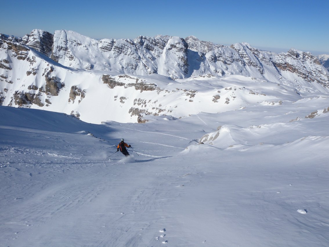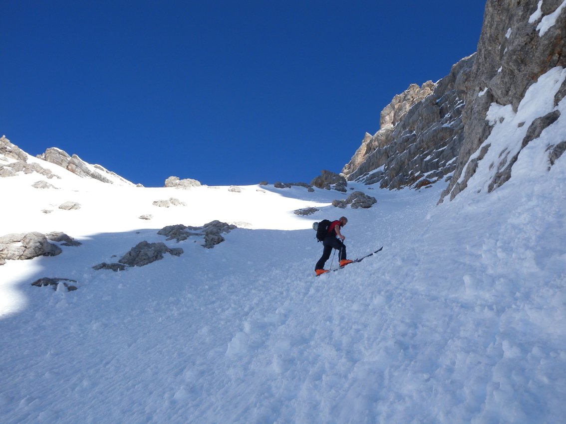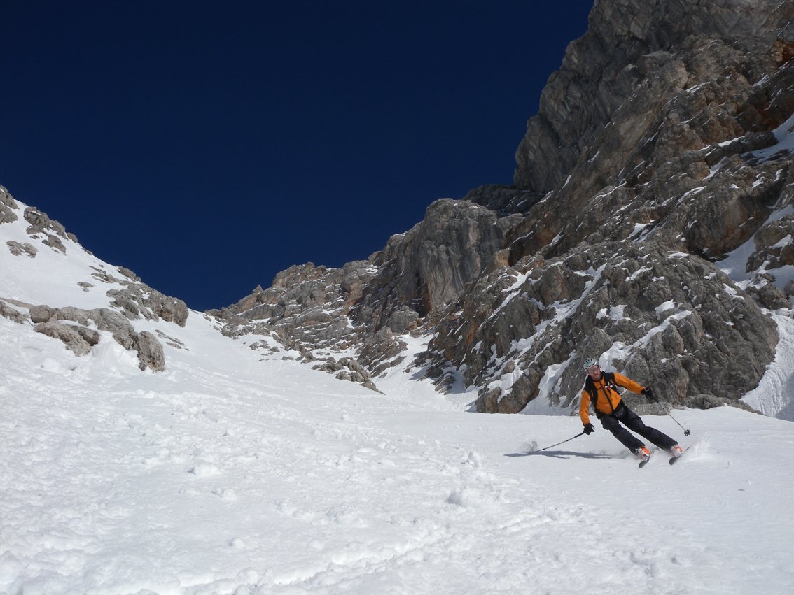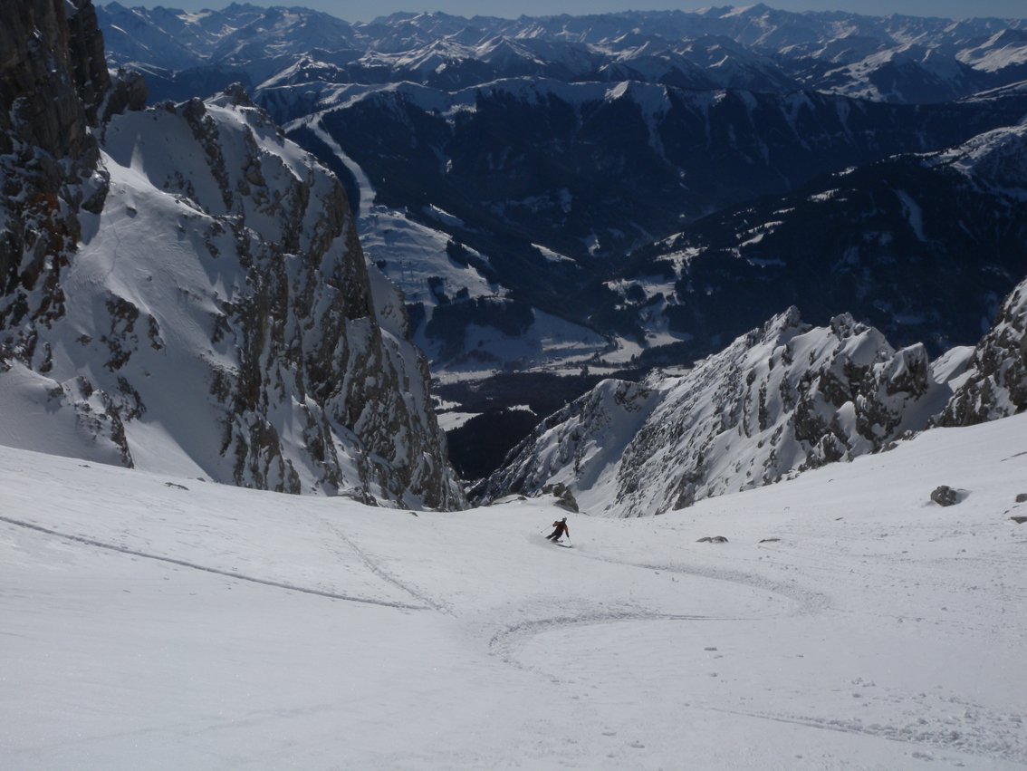 Grundsätzlich eine anspruchsvolle, steile Tour, welche man nur bei sicheren Schneeverhältnissen und bei Firn macht. Der Hang ist bald in der Sonne, früher Aufbruch ist ratsam. Teils sind kurze, heikle Steilstufen zu bewältigen - gute Skitechnik nötig.
