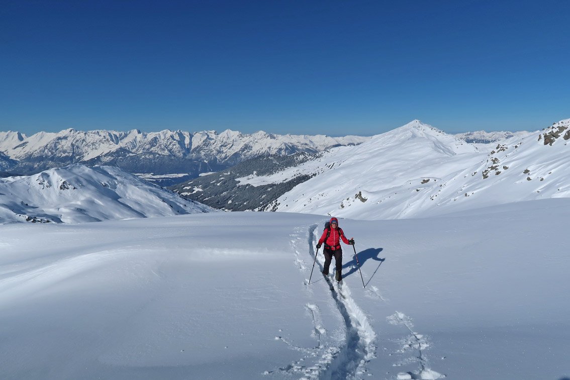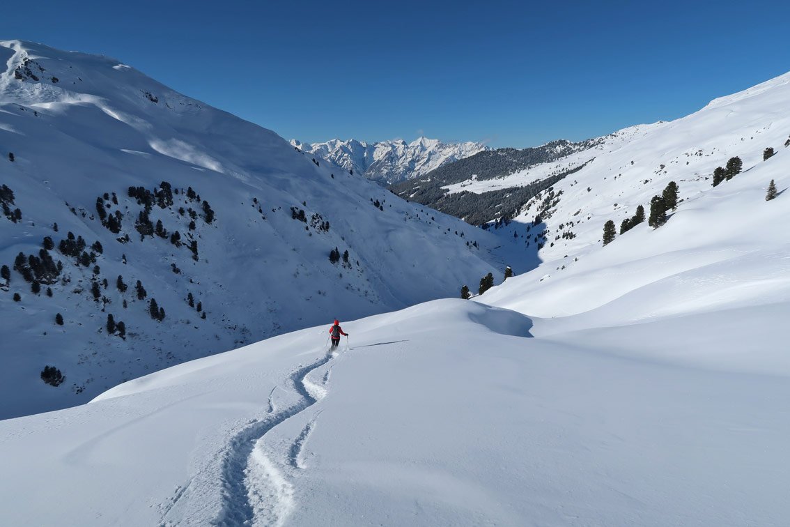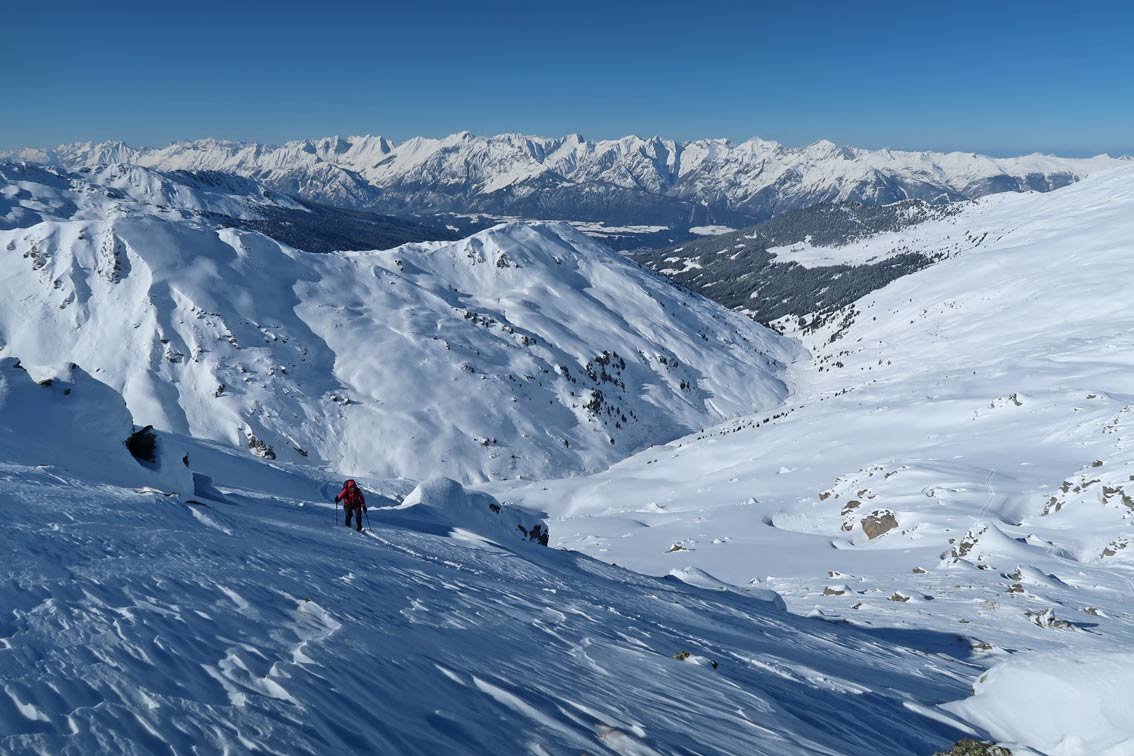 Schöne, von Innerst aber nur selten gemachte Skitour. Die Tour ist am besten, wenn man vom Gipfel zuerst in Richtung Hochfügen abfährt, dann die ca. 150 Hm wieder zum Pfundsjoch aufsteigt und dort dann zur Oberen Nurpsenalm abfährt. So kommen die vermutlich besten Abfahrtshänge im Nurpsental zusammen, bei denen man in der Regel auch noch Platz für die eigene Spur hat. Der Anstieg zum Rosskopf ist deutlich besser als der zum kleinen Gilfert (immer überlaufen) und zum Rastkogel (zu weit hinten) - wer unverspurte Pulverhänge sucht, wird dort meist fündig.