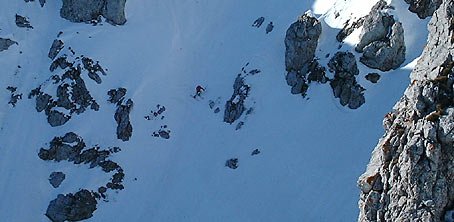 Die Rote Schütt Flanke ist wohl die markanteste eigenständige (Einfahrt) in die Breite Reis und ist mit ihren gut 350 m auch von Puchberg aus zu erkennen. Die Einfahrt (40°) ist sicherlich das Kriterium. Hier braucht man einfach etwas Mut, um die oft unangenehme Wächte zu überwinden. Es folgen noch ein paar beherzte Schwünge in steilem Gelände, wobei man kerzengerade hinabfährt. Danach wird es jedoch gleich flacher und gemütlicher. Stürzen sollte man auch bei den ersten Metern nicht, doch hat ein Sturz keine so fatalen Folgen wie in der Privatries.