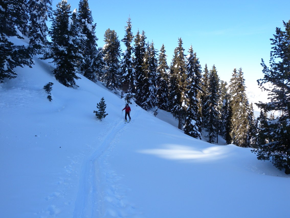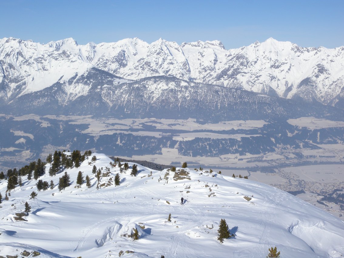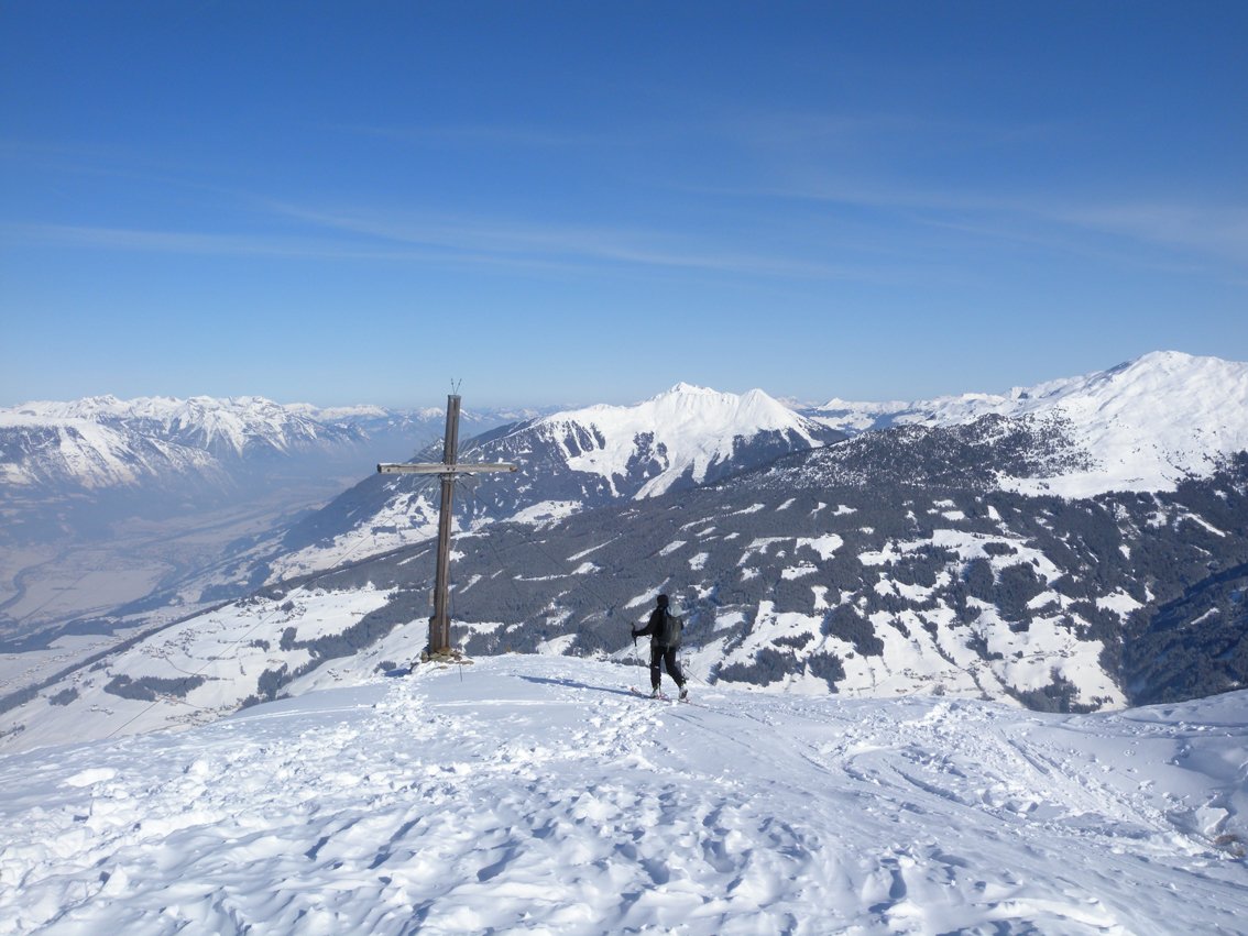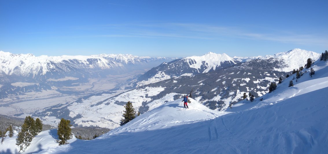 Schöne, sehr einfache und bei vernünftiger Spurlage auch relativ lawinensichere Skitour auf die Rote Wand. Unten verläuft die Route über schöne Wiesen, in der Mitte geht man entlang der Forststraße und oben im lichten Wald bis zum Gipfelkreuz. Schöner Ausblick ins Inntal und das Karwendel.