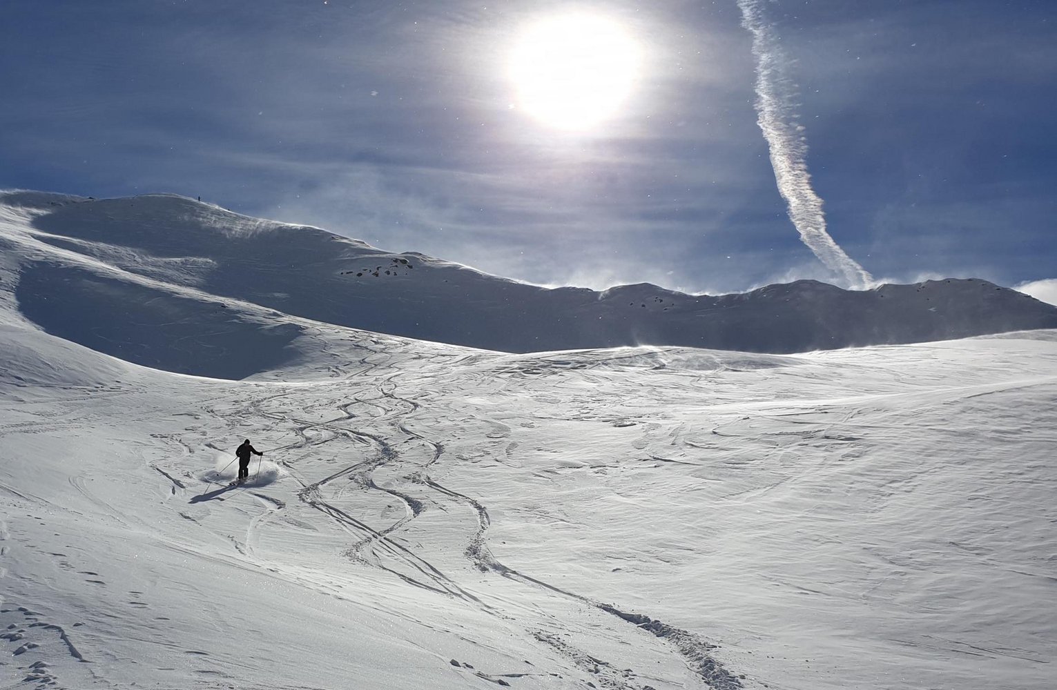 Abfahrt wie Aufstieg. Die direkte Abfahrt vom Nordrücken nur bei sicheren Lawinenbedinungen!