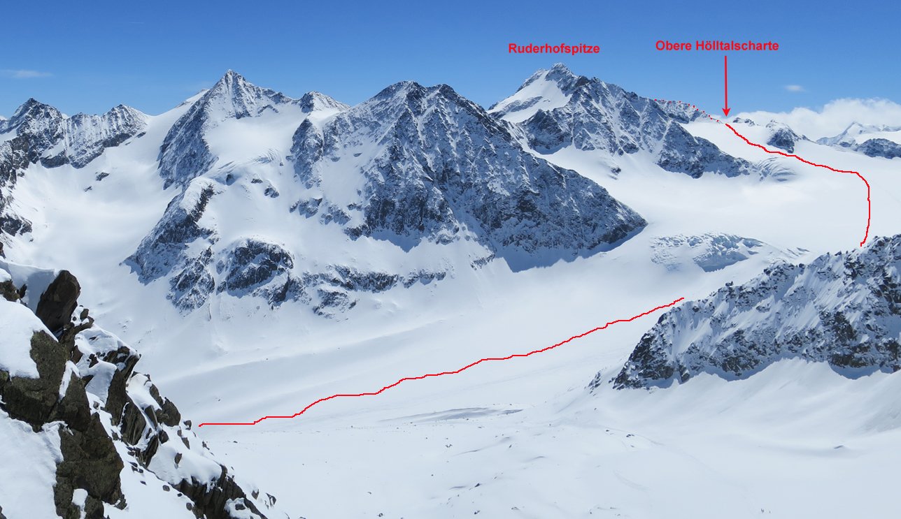 Von der Franz Senn Hütte flach entlang des Alpeiner Baches taleinwärts und über einen Aufschwung zum Beginn des Alpeiner Ferners. Bei der Spaltenzone beim 2. Aufschwung hält man sich rechts und gelangt auf das hintere Gletscherplateau. Im Bereich der Südl. Wildgratspitze quert man schräg nach links über das Plateau zur oberen Hölltalscharte (3247 m). Dort Skidepot. Dann steigt man in rund 1 Std. über den Südwestgrat, der am Anfang und in der Gipfelwand mit leichter Kletterei bis 1 aufwartet, zum höchsten Punkt der Ruderhofspitze.