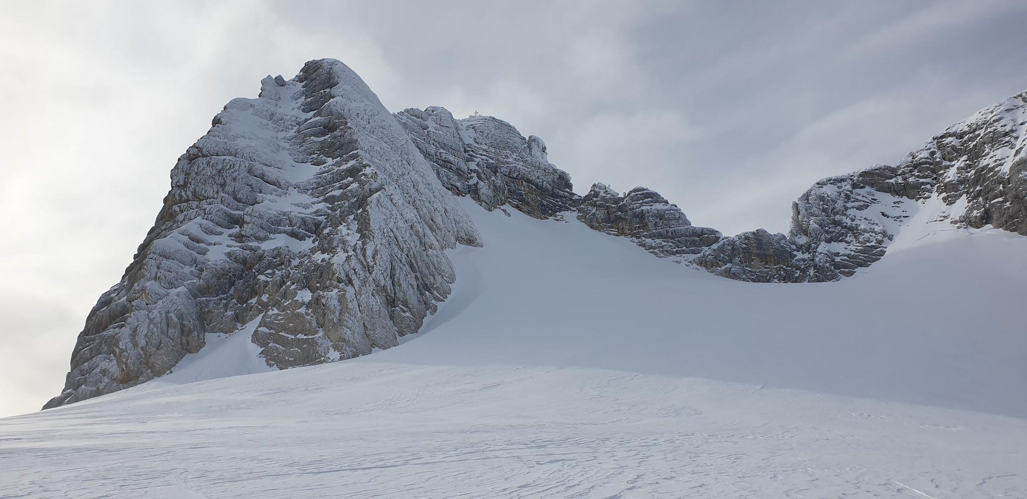 Wer den anspruchsvollen (Diff.: 3 und A) Dachstein Gipfel machen möchte, geht nicht bis ganz zur Dachsteinwarte, sondern quert (Stangenmarkierung) davor nach rechts und steigt über den steilen Gipfelhang (Lawinengefahr!) zum Beginn des versicherten Randkluftsteiges auf. Hier Skidepot. Weiter ca. 120 Hm über den versicherten (ABER im Winter verschneiten!) Klettersteig zum Gipfel des Dachsteins. (Zeitbedarf: Ab der Abzweigung vor der Dachsteinwarte ca. + 1,5-2 Std. bis zum Gipfel und 3/4-1 Std. retour, d.h. insbesamt + 2 1/4 bis 3 Stunden!).