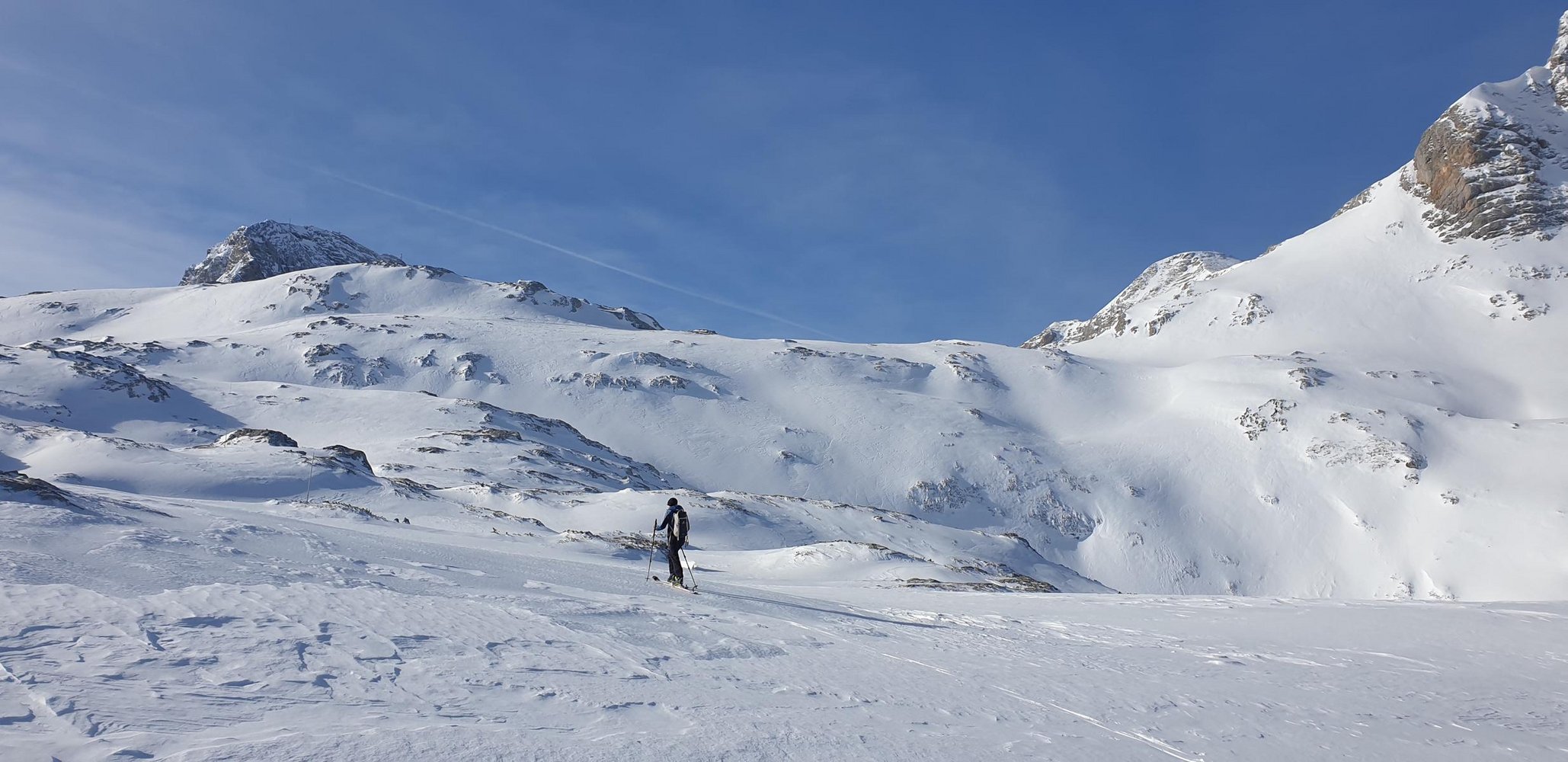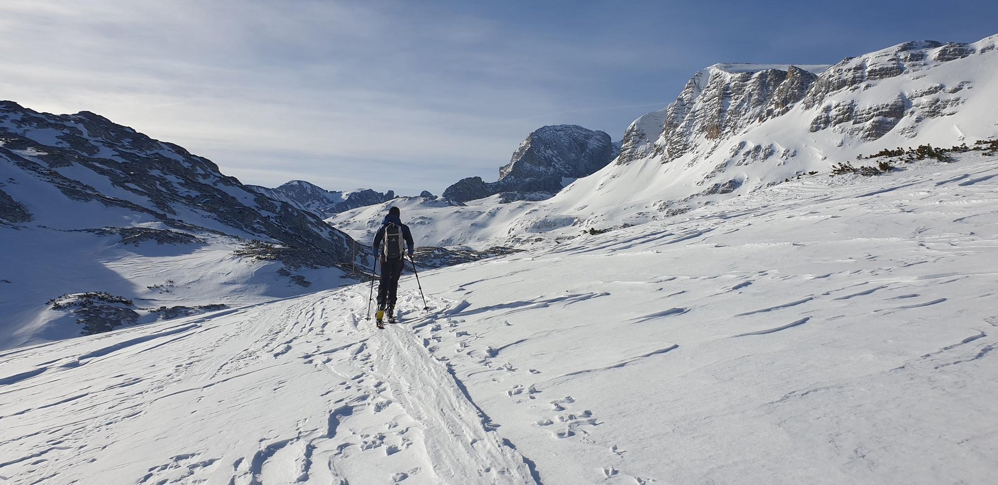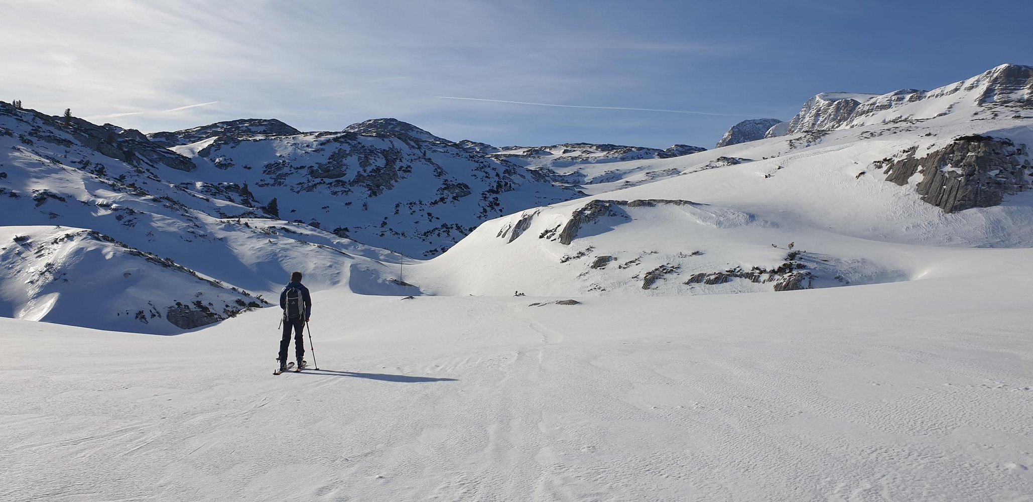Die Rumpler-Runde ist lang und die Abfahrt ist aufgrund der kurzen Gegenanstiege (in Summe ca. 200 Hm!) auch kraftraubend. Nichts für Skitouren-Anfänger und konditionsschwache Geher.