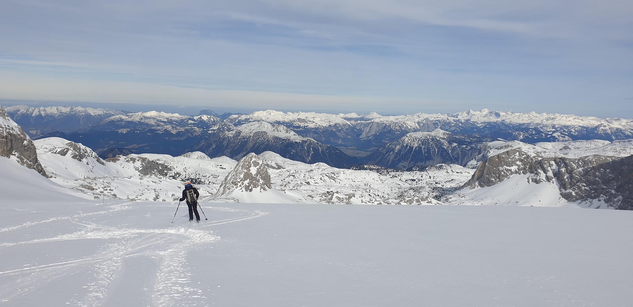 Eindrucksvolle, schneesichere, beliebte und mit rd. 11 km / 1330 Hm Aufstieg auch lange Skirundtour am Dachstein. Wer nicht bei der Dachsteinwarte umdreht und den Dachstein Gipfel mitnimmt, gelangt in anspruchsvoller Kletterei (Klettersteig A, aber es liegt viel Schnee in den Rinnen) auf den höchsten Berg Oberösterreichs und der Steiermark. Die Abfahrt ist sehr lang 15 km und 2770 Hm. Sie hat auch 5 kleine, aber nach der langen Tour durchaus kraftraubende Gegenanstiege, die ohne Auffellen gut zu meistern sind. Die Abfahrt über den Halstätter Glescher über Simonyhütte und Gjaidalm nach Obertraun wird auch als Nationalskitour vermarktet, wobei man mit der Dachsteinsüdwandbahn auffahren soll und lediglich die Abfahrt der Rumpler Runde macht.