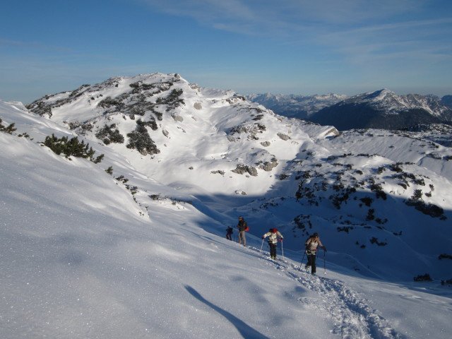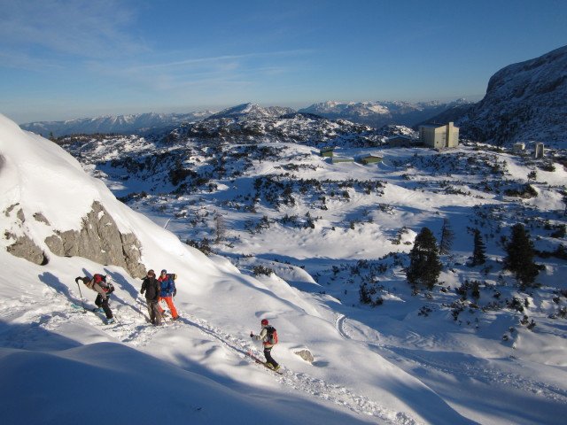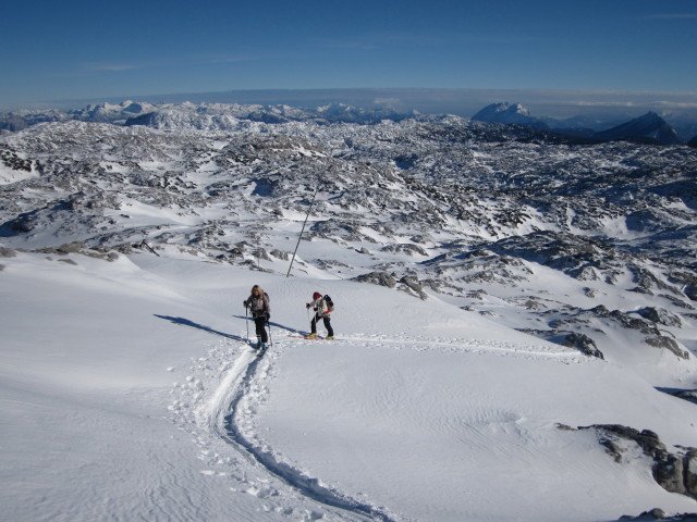 Abfahrt: Über den Hallstätter Gletscher zum Oberen Eissee abfahren. Nach kurzer Steigung kann ins Taubenkar abgefahren werden. Hier sollte neuerlich angefellt werden. Im Taubenkar recht mühsam im steten Auf und Ab, bis man auf die Stangenmarkierung von der Skitour zur Simonyhütte trifft. Nun dieser Stangenmarkierung in nordöstlicher Richtung zur Gjaidalm (nach der Soacherklamm zwei Varianten) folgen. Von der Gjaidalm (1738 m) mit dem kurzen Übungslift (kostenlos) zur Skipiste hinauf und die Skipiste über Krippenbrunn (1550 m) zur Talstation der Dachstein-Seilbahn (600 m) abfahren.