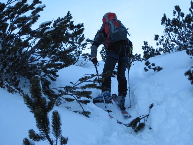 Aufstieg: Von der Bergstation der Dachstein-Seilbahn über die Skipiste zur Gjaidstation (1788 m) abfahren. Nun zur Kaserne Oberfeld (1832 m) aufsteigen und ab der Kaserne den teilweise durchaus weit voneinander entfernten Stangenmarkierungen folgen. Unterhalb des Mittersteins kommt das Skigebiet des Dachstein-Gletschers in Sicht. Hier abfellen und zur Mitterstein-Sesselbahn abfahren. Mit der Sesselbahn und dem anschließenden Schlepplift in den Gjaidsteinsattel fahren.