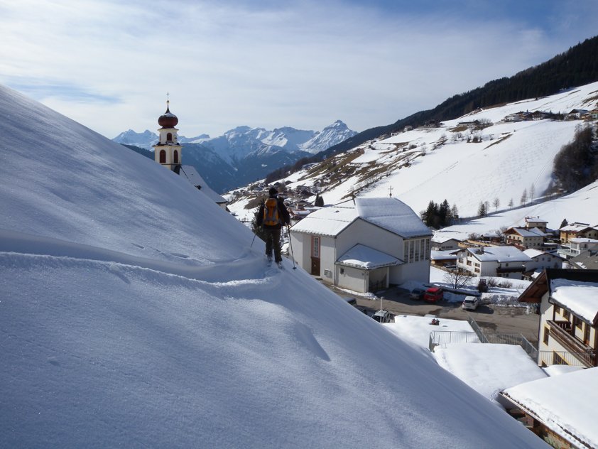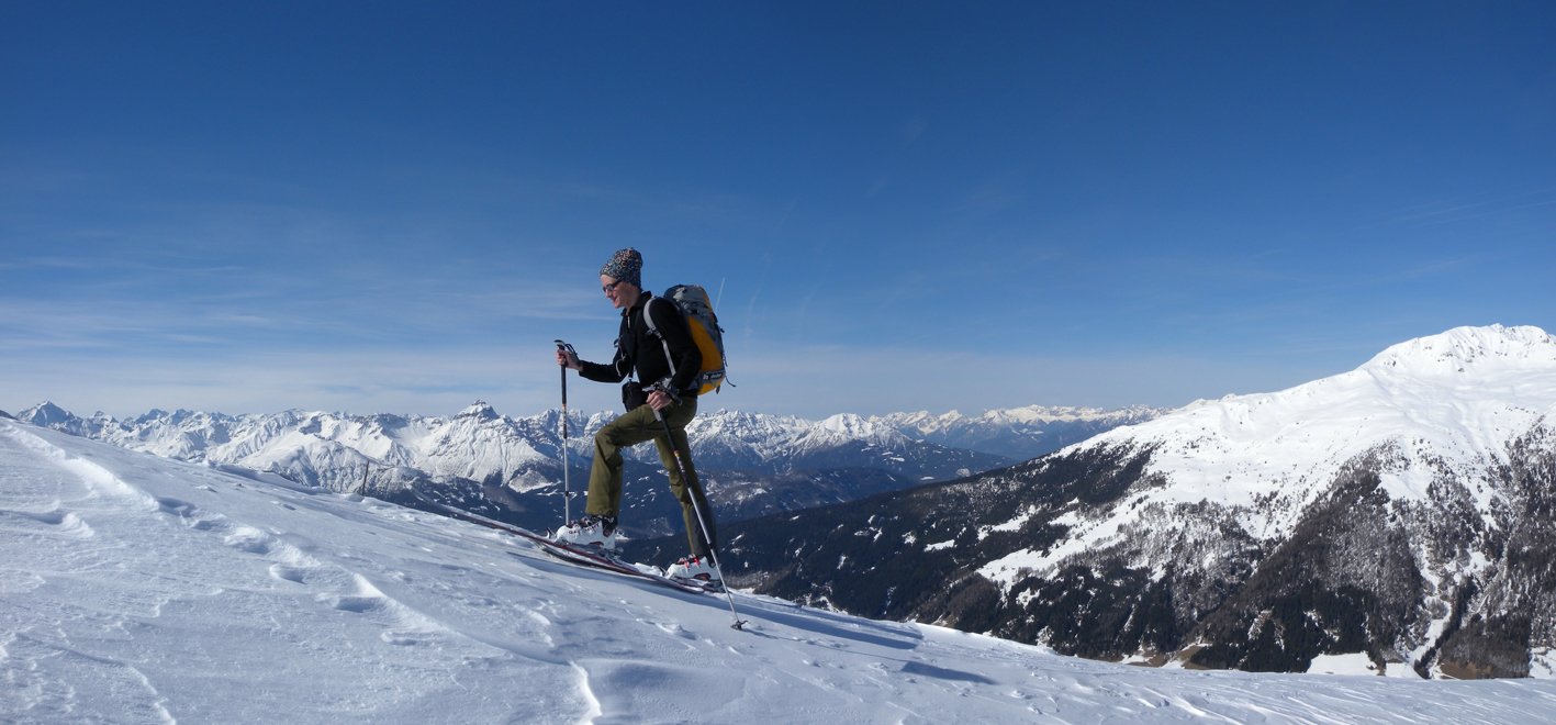 Die Schafseitenspitze ist eine gewaltige Skitour im Navistal, die bei sicheren Schneeverhältnissen perfekte Abfahrtshänge bietet. Die Tour fängt gemächlich an, man träumt sich quasi hinauf bis auf den breiten Grat oberhalb des Hochlegers - spätestens wenn man vor den zwei Felszacken steht, wacht man auf. Die Tour wird dort alpiner und steiler, bei sicheren Schneeverhältnissen ist aber alles nur halb so schlimm. Das Gipfelkreuz des "Wintergipfels"steht etwas unter dem Hauptgipfel, dort wird in der Regel die Tour beendet, nur wirklich hartgesottene gehen die letzten 80 Hm hinauf bis zum Hauptgipfel.