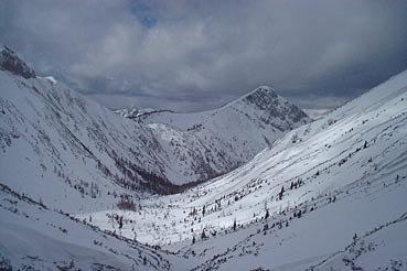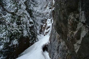 Der Austieg folgt gut 20 min der Forststraße, bis man vor einer Talenge mit Brücke rechts auf einen Weg mit Wegweiser `Kleinbodengraben’ abzweigt. Dieser führt anfangs auf einen gerodeten Rücken, dann aber links durch Jungwald in den anfangs engen Graben (siehe Bild). Nun folgt der rot markierte Weg dem Graben bis auf den weiten Melkboden, an dessen Ende es steil zum Windberg geht. Bei unsicherer Lawinenlage vorher links auf den Kamm und weiter zum Gipfel. Bei Schlechtwetter sehr schwierig zu finden!
