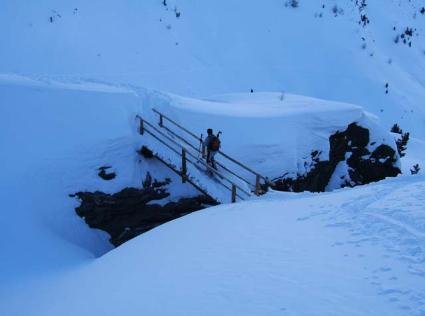 Von der Hütte (der Anstieg zur Hütte folgt im wesentlichen dem Sommerweg; ca. 02:00 Stunden) leicht fallend Richtung Westen unter dem Tristennöckl vorbei wo man die Schlucht auf eine Brücke überqueren kann. Nun immer in der ausgeprägten Mulde über mehrer Steilstufen aufwärts bis unter die Felsen des Vorgipfel. Hier nach links queren und über den letzten Hang auf den Vorgipfel (Skidepot). Nun in leichter aber etwas ausgesetzter Kletterei zum höchsten Punkt mit Kreuz.